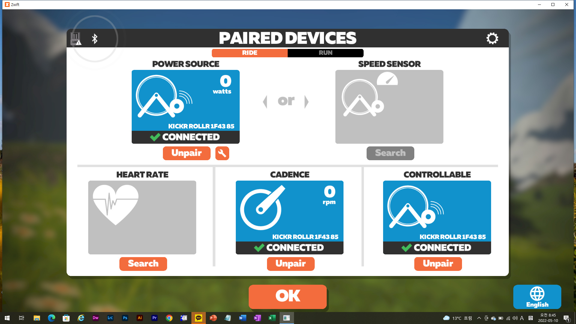 즈위프트에 블루투스로 연결하면 KICKR ROLLER로 모두 선택할 수 있다.