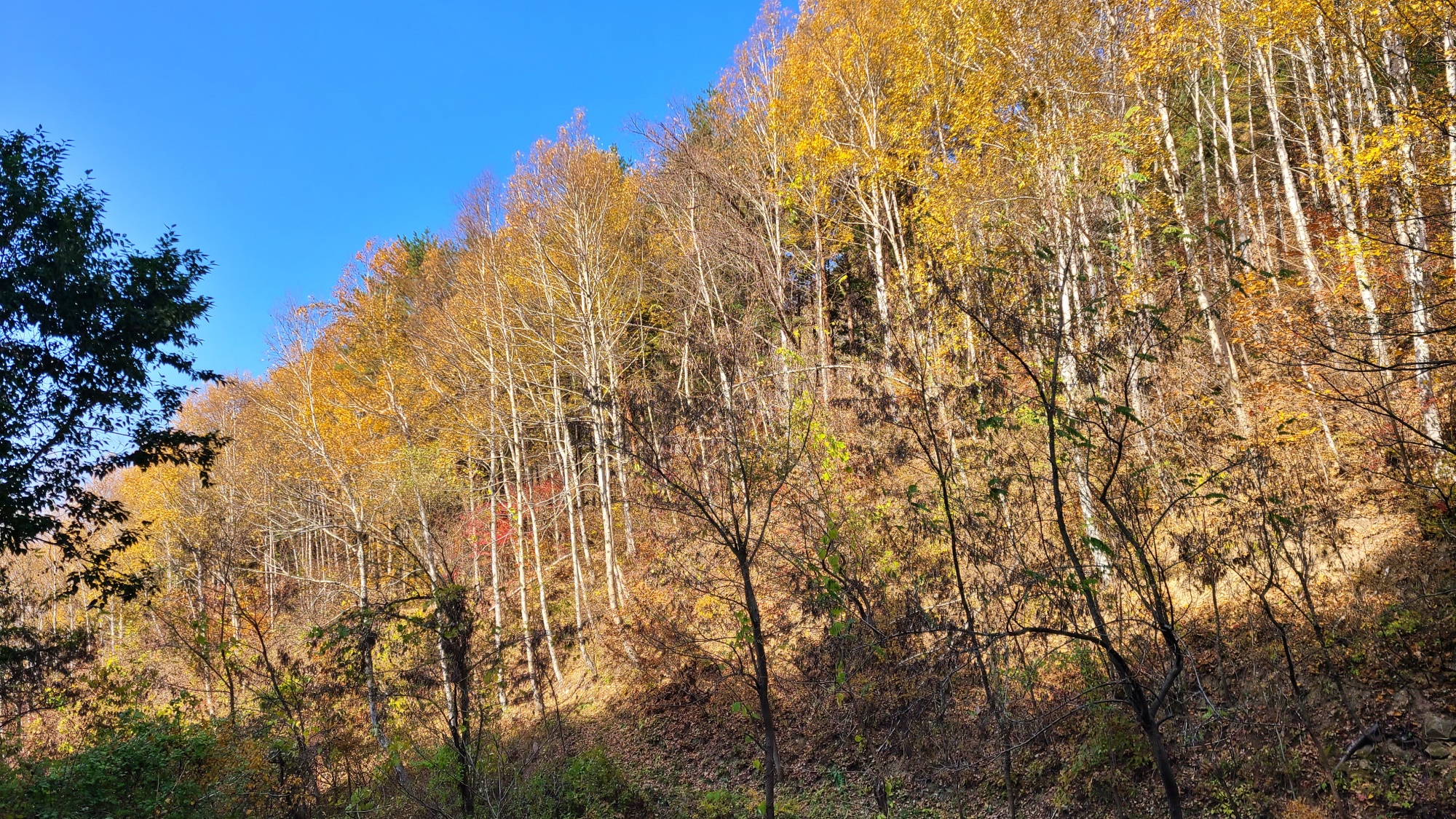 다운힐 중간에 밭을 지나고 나면 치유의길의 진면목을 볼 수 있다. 낙엽송이 만들어낸 환상적인 풍경에 '이곳에 오길 잘했어'라는 생각 뿐이다. 파란 가을하늘과 노란 낙엽송을 혼자만 즐기기에 미안한 마음까지 든다.
