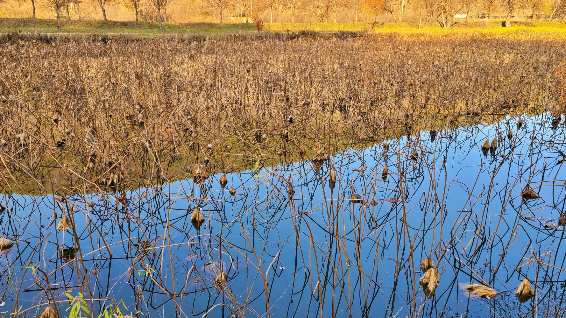원남제는 연꽃이 유명하지만 철지난 연꽃밭은 휑할 뿐이다.