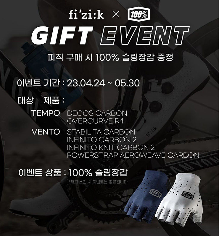 또, 피직의 사이클링 슈즈를 구매할 경우, 100%의 슬링장갑을 함께 선물로 증정하는 이벤트도 진행하고 있다. 피직의 로드 사이클링 슈즈는 편안한 장거리 주행에 적합한 템포(Tempo) 라인업과 레이스 스피드에 집중한 벤토(Vento) 라인업으로 구분되어, 다양한 로드 라이더들의 스타일을 커버할 수 있다.