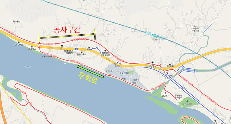 지난 3월부터 공사를 시작했던 양평군 오빈리 근처 자전거 국토종주 구간이 오는 6월 말까지 공사로 인해 단절된다. 그리고, 우회 도로의 안내에 따라 길을 찾기가 다소 난해하여, 우회 도로에 대한 상세 소개를 정리해 보았다.