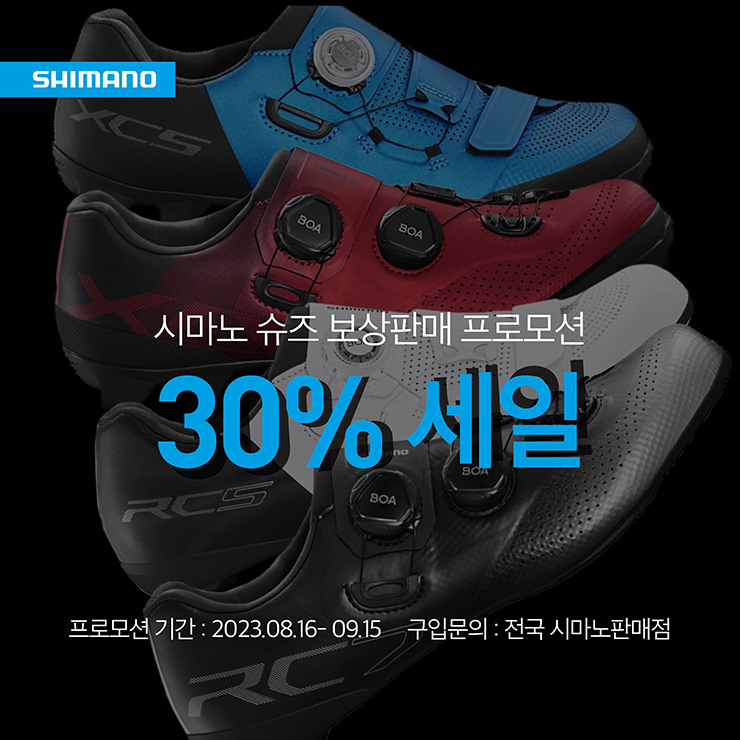 시마노(SHIMANO)는 오는 9월 15일까지 로드와 산악 퍼포먼스 슈즈를 30% 할인된 가격으로 구매할 수 있는 보상판매 프로모션을 진행한다.