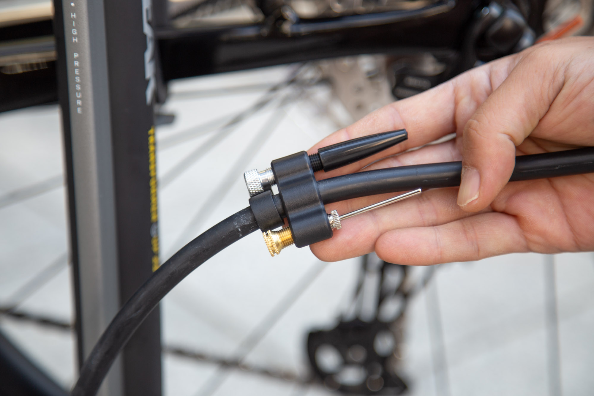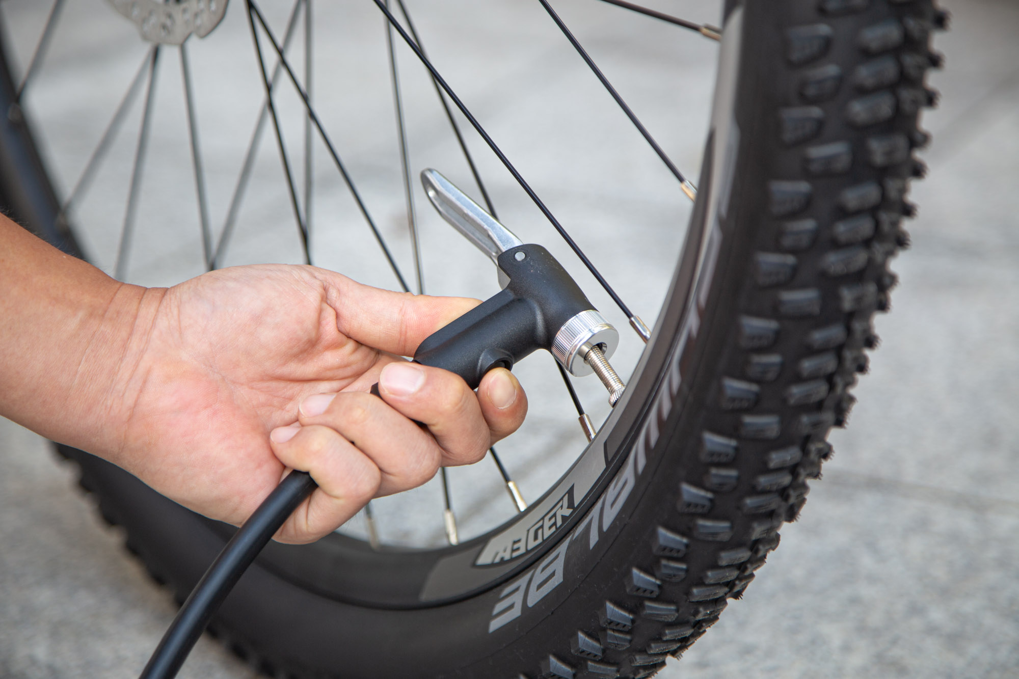 타이어에 공기압을 넣을 때는, 자전거에 킥스탠드가 달려있지 않는 한 어딘가에 자전거를 안정적으로 세워야 한다.