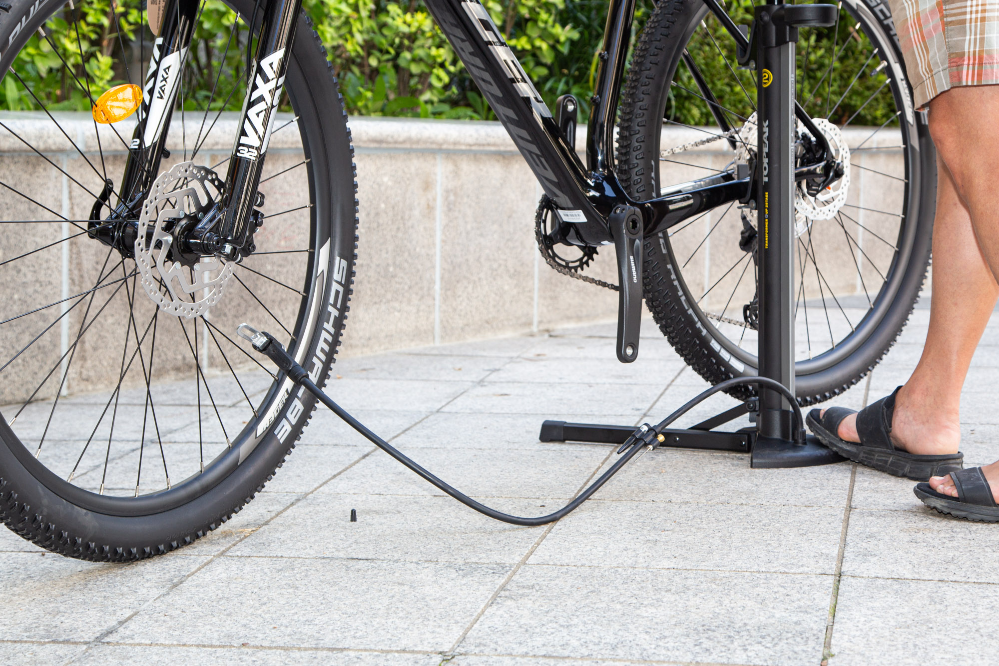 토픽 트랜스포머 펌프는 자전거를 세우고 공기를 주입할 수 있는 과정을 한 제품으로 해결할 수 있다는 게 가장 큰 특징이다. 체인스테이와 시트스테이에 거치하는 스탠드 방식은 무거운 중량의 자전거도 세울 수 있으며 안정감이 높은 편이다.