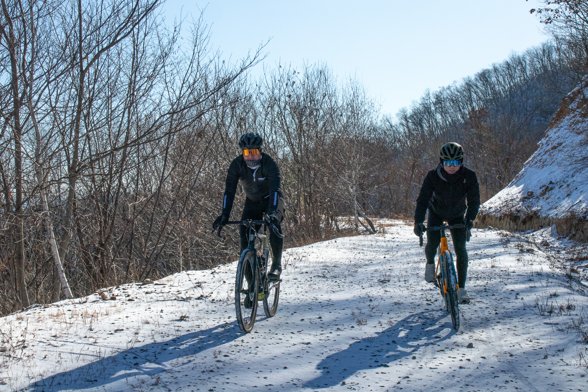 라이딩 초반 공도 주행은 차가운 맞바람을 맞으며 힘겨웠지만, 산악 그래블로 들어가자 바람이 줄어들고 따뜻한 햇빛 덕분에 라이딩을 즐길 수 있었다. 또, 하루 전에 내린 눈이 쌓인 임도를 자전거로 달리는 멋진 경험도 더해졌다.