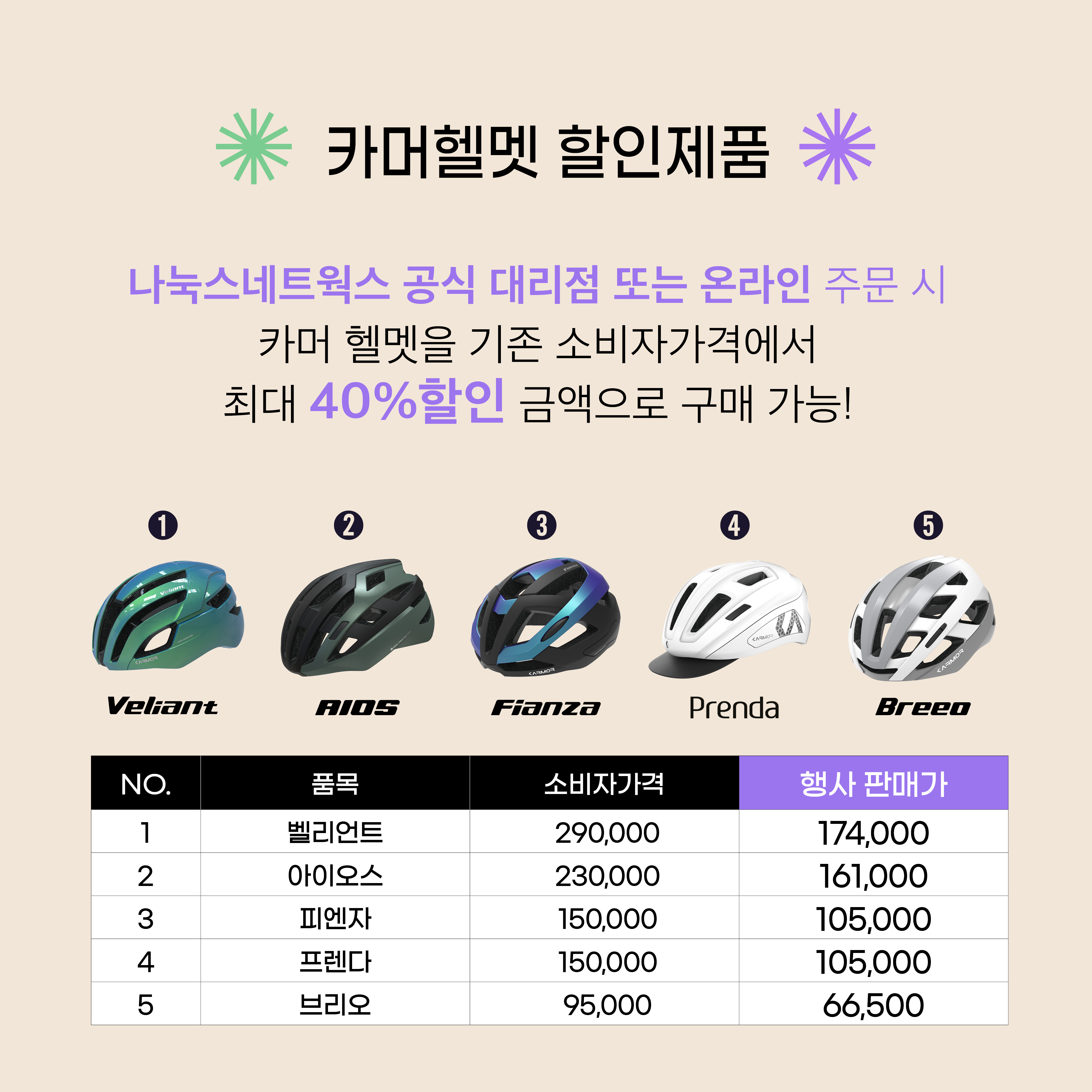 우리나라의 헬멧 브랜드 카머(Kamor)는 오는 9월 30일까지 최대 40% 할인 및 간식 기프티콘 선물 증정 프로모션을 진행한다. 이번 프로모션은 카머의 벨리언트, 아이오스, 피엔자, 프렌다, 브리오 5개 모델에 모두 해당되며, 최상급 벨리언트를 10만원대에 구매할 수 있는 기회가 될 수 있다.