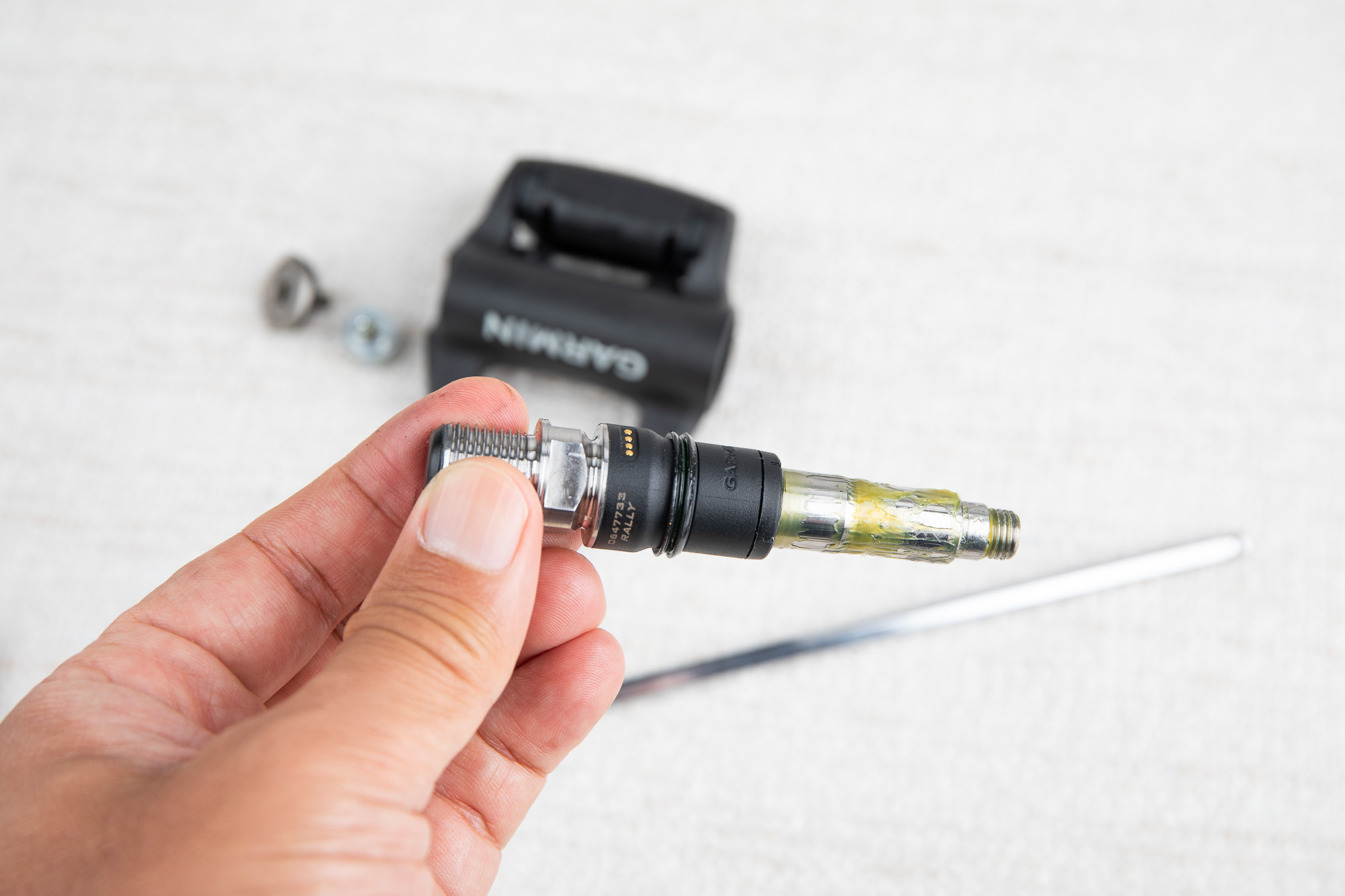 페달 파워미터의 가장 핵심적인 부분은 바로 스핀들에 있다. 가민은 그 스핀들 안에 스트레인 게이지와 각종 전자 장치 및 배터리를 삽입하고, 견고하게 밀봉하여, 내구성 및 정확도를 높였다.