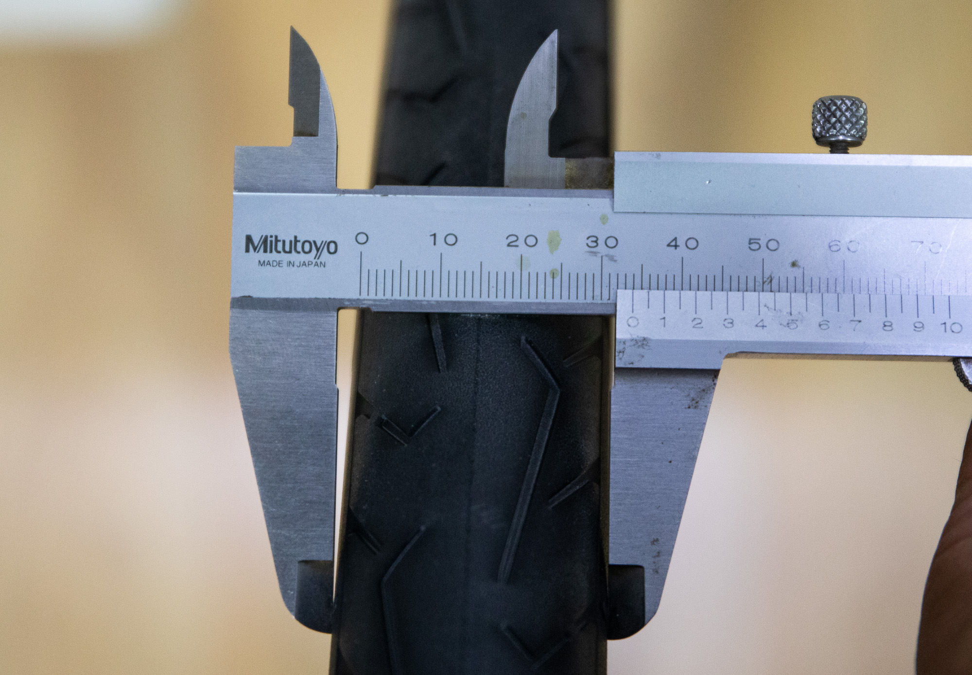 림 내부폭 21.5mm 휠에 장착 시, 35c 타이어는 34mm의 사이즈를 보여주었다.