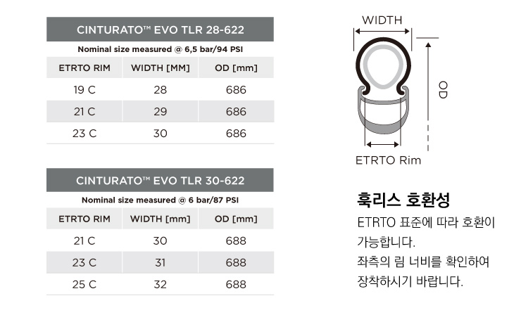 28mm 이상의 모든 사이즈의 타이어는 훅리스 림과 호환되며, 73 psi 이하의 공기압을 사용해야 한다.