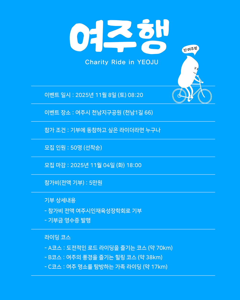 이번 행사는 11월 8일(토) 08:20부터 12:30까지 진행되며, 집결 장소는 여주시 천남지구공원 주차장(천남1길 66)이다. 기부에 동참하고 싶은 라이더라면 누구나 참여할 수 있으나, 모집 인원은 50명으로 선착순 마감되니 빠른 신청이 필요하다.