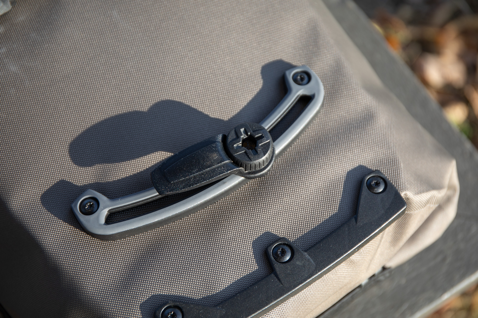 아래의 후크는 다이얼을 푼 후에 위치를 옮겨 랙 튜브의 위치에 맞게 설정하기만 하면 된다. 상단 후크 또한 레버를 열고 쉽게 위치를 옮길 수 있어서, 거의 대부분의 짐받이 랙과 호환된다.