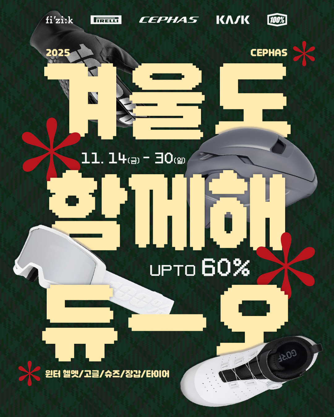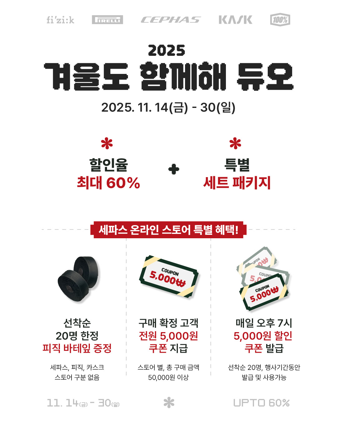 이번 프로모션은 세파스·피직·카스크 공식 스토어에서 참여할 수 있다. 본격적인 겨울 라이딩 시즌을 앞두고 필요한 장비를 미리 합리적인 가격에 마련할 수 있는 좋은 기회다.