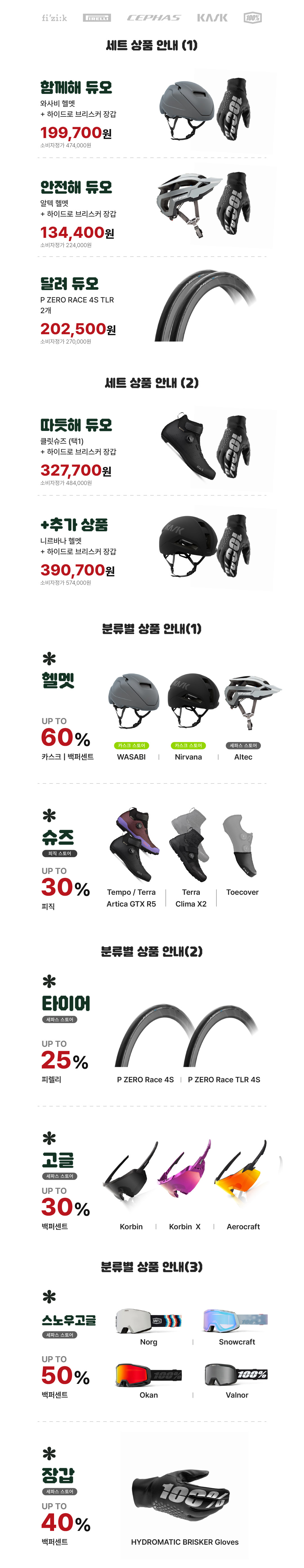 이번 프로모션에는 헬멧, 고글, 슈즈, 장갑, 타이어 등 겨울 라이딩에 꼭 필요한 장비들이 총망라되었다. 특히, 많은 라이더들의 사랑을 받는 와사비·알텍·니르바나 헬멧, 피직 윈터 슈즈, 피렐리 PZERO 타이어, 그리고 100% 고글·장갑 등 인기 제품군이 할인 대상에 포함되어 눈길을 끈다.