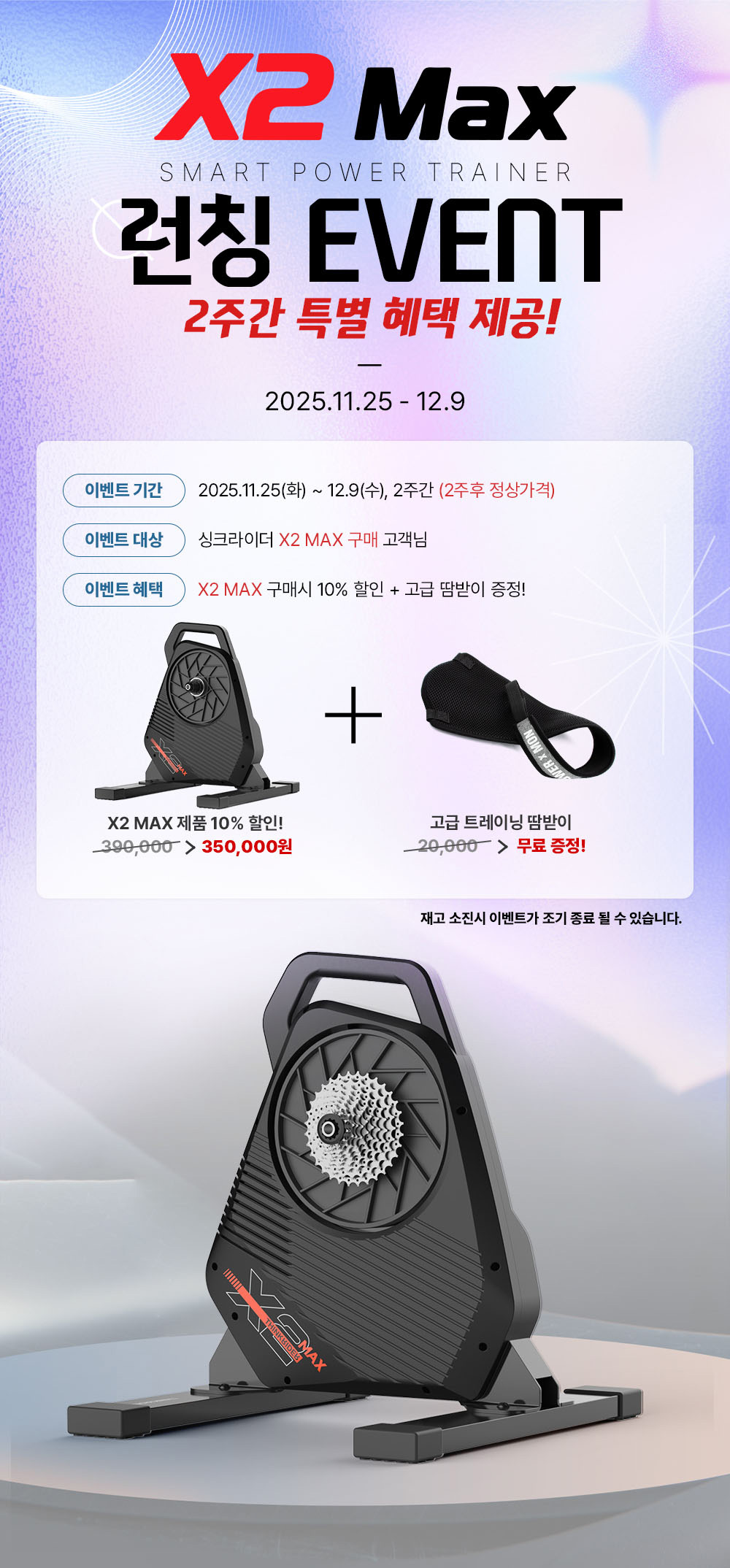 이번 런칭 이벤트 기간 동안 X2 MAX를 구매하는 고객은 정가 대비 10% 할인된 가격으로 제품을 만날 수 있다. 또한, 실내 트레이닝 시 프레임 부식을 방지하고 쾌적한 운동 환경을 돕는 '고급 땀받이'가 사은품으로 함께 증정된다.