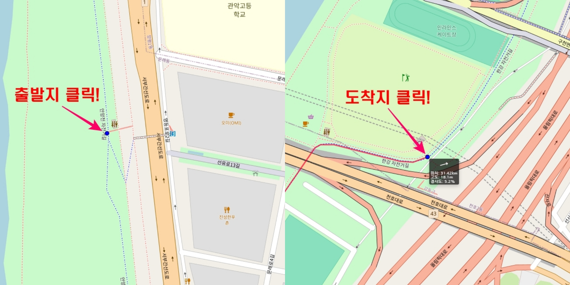 출발, 경유, 도착지를 차례로 클릭하여 코스 생성