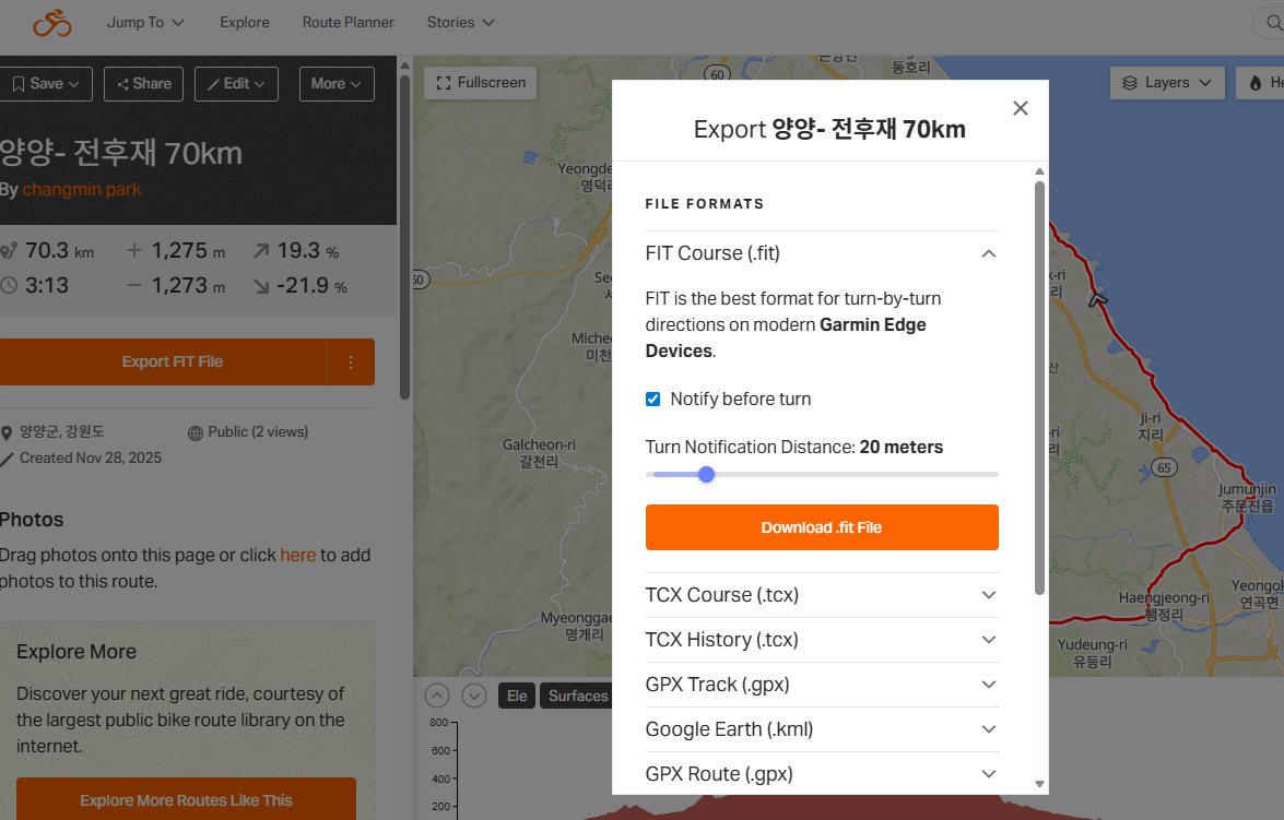 코스를 다 그렸다면 파일로 저장해야 한다. 흔히 사용하는 GPX 파일이나 큐시트가 포함된 TCX 파일도 있지만, 속도계 내비게이션을 많이 사용하는 라이더라면, FIT 파일을 더 선호한다.