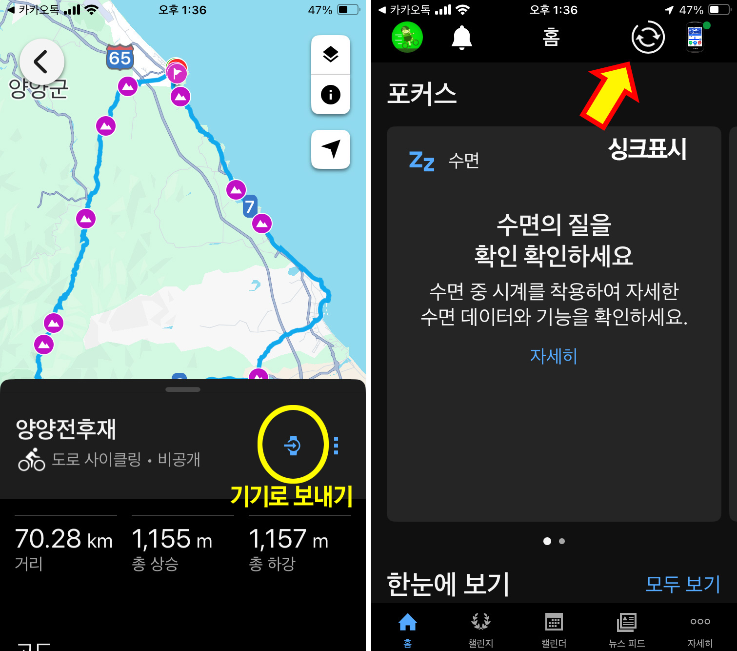 7. 자동 싱크를 통해 가민 엣지에 업로드. 필요할 경우 앱 상단 싱크 버튼을 누른다.