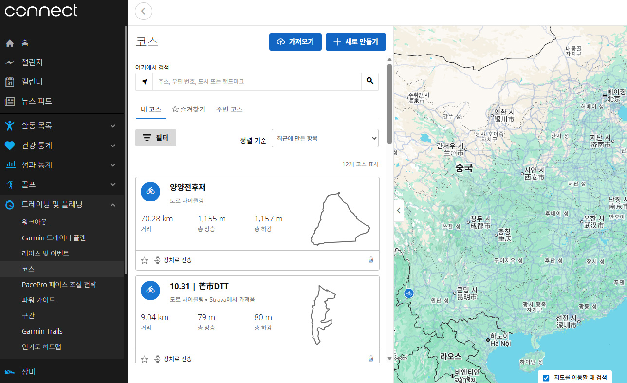 가민 커넥트 웹사이트에 로그인 후 코스 파일을 업로드 할 수 있다.