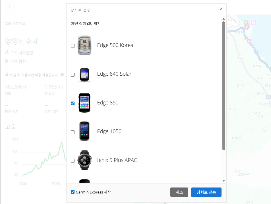 보내고자 하는 가민 엣지 장비를 선택한다.