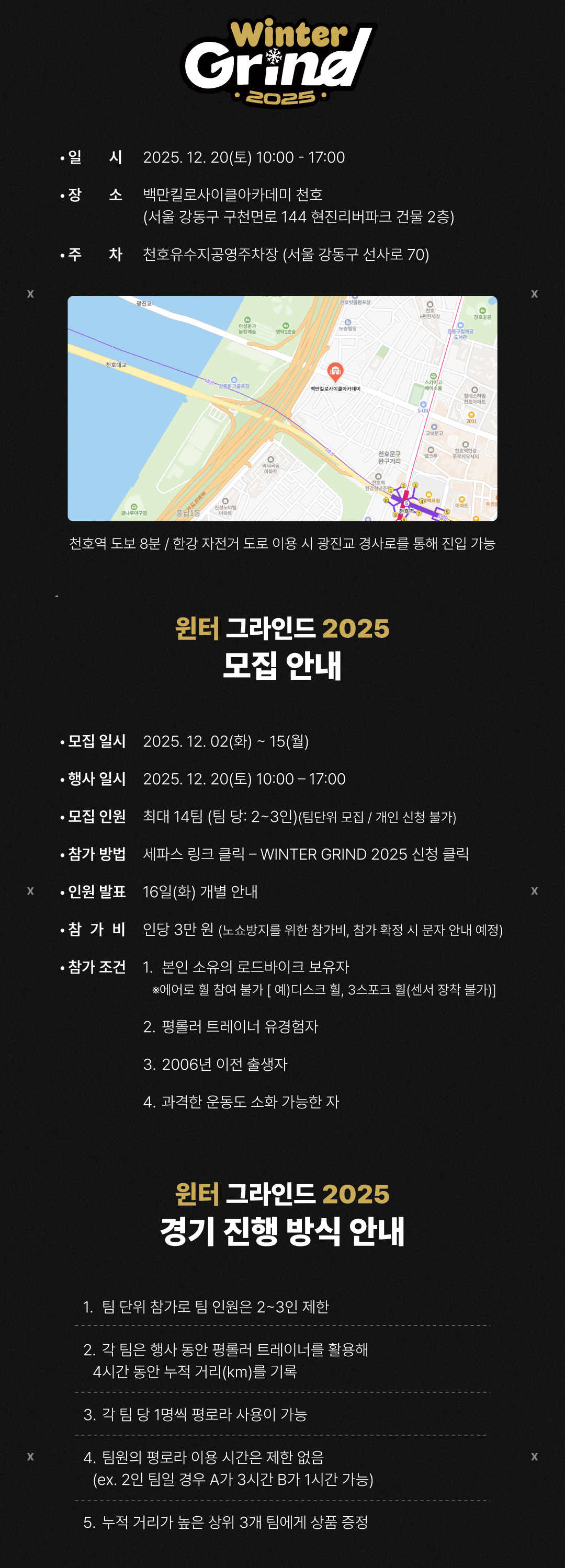 오는 12월 20일 토요일, 서울 천호동에 위치한 백만킬로사이클아카데미에서 열리는 이번 행사는 단순한 경쟁을 넘어 배움과 나눔이 함께하는 축제로 기획되었다.