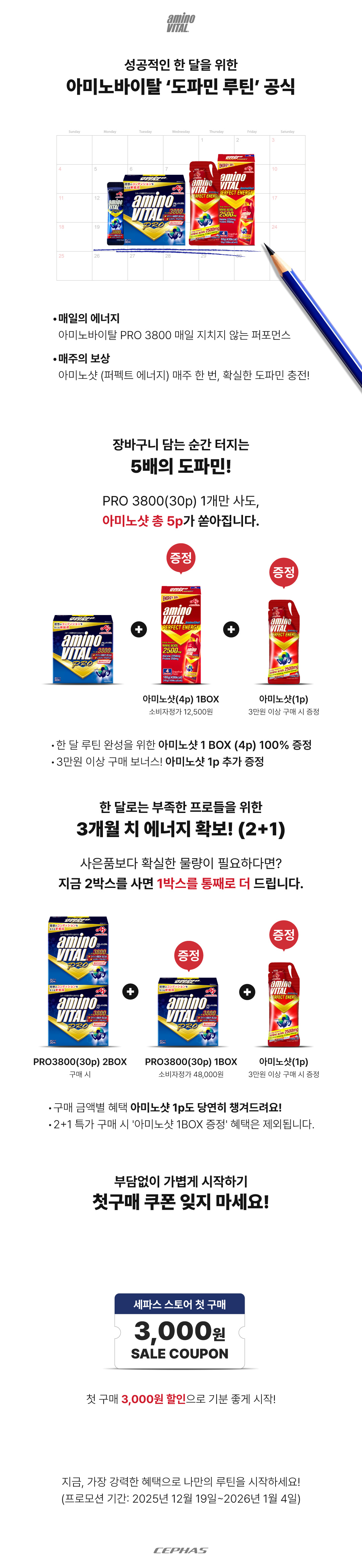 아미노바이탈의 공식 수입원 세파스는 12월 19일(금)부터 2026년 1월 4일(일)까지 약 2주간 "지루한 반복은 끝! 터지는 혜택으로 완성하는 나만의 '한 달 도파민 루틴'" 프로모션을 실시한다고 밝혔다.