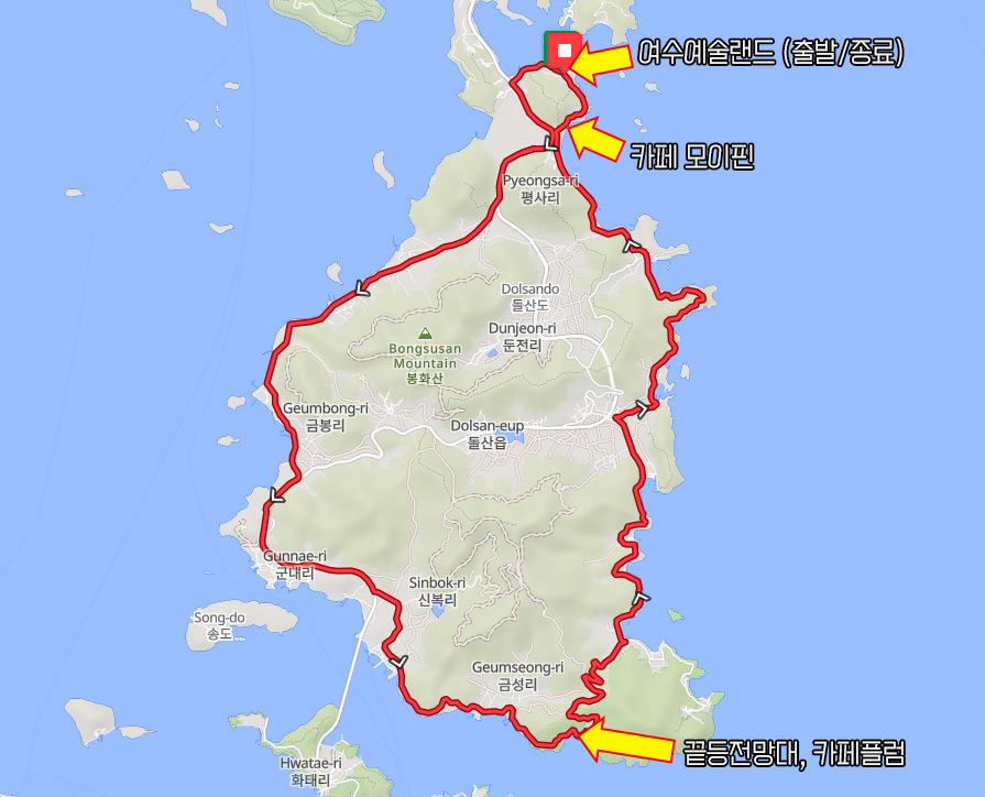 돌산도 한바퀴는 전체적으로 업다운이 많은 롤링 코스이지만, 카페플럼을 지나면서 이번 코스의 유일한 업힐로 꼽히는 금오산 구간이 나타난다. 거의 2km 정도의 거리로 초반 경사가 비교적 높기 때문에, 끝등전망대 또는 카페플럼에서의 휴식을 추천하는 이유이기도 하다.