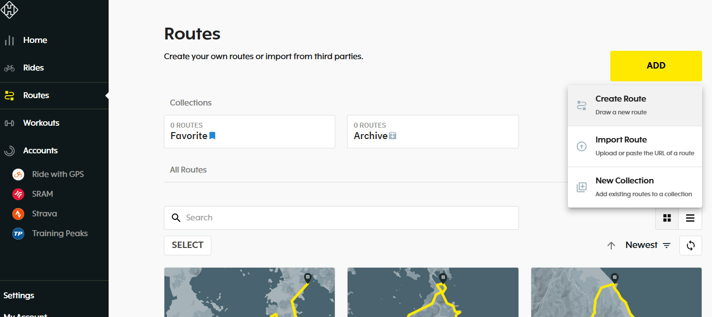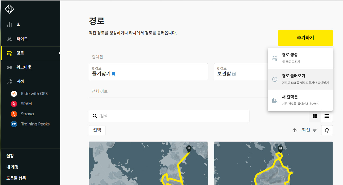 먼저, 대쉬보드 웹사이트(https://dashboard.hammerhead.io/)를 통해서 업로드 할 때는, 왼쪽 [경로] 메뉴로 이동하여 할 수 있다.