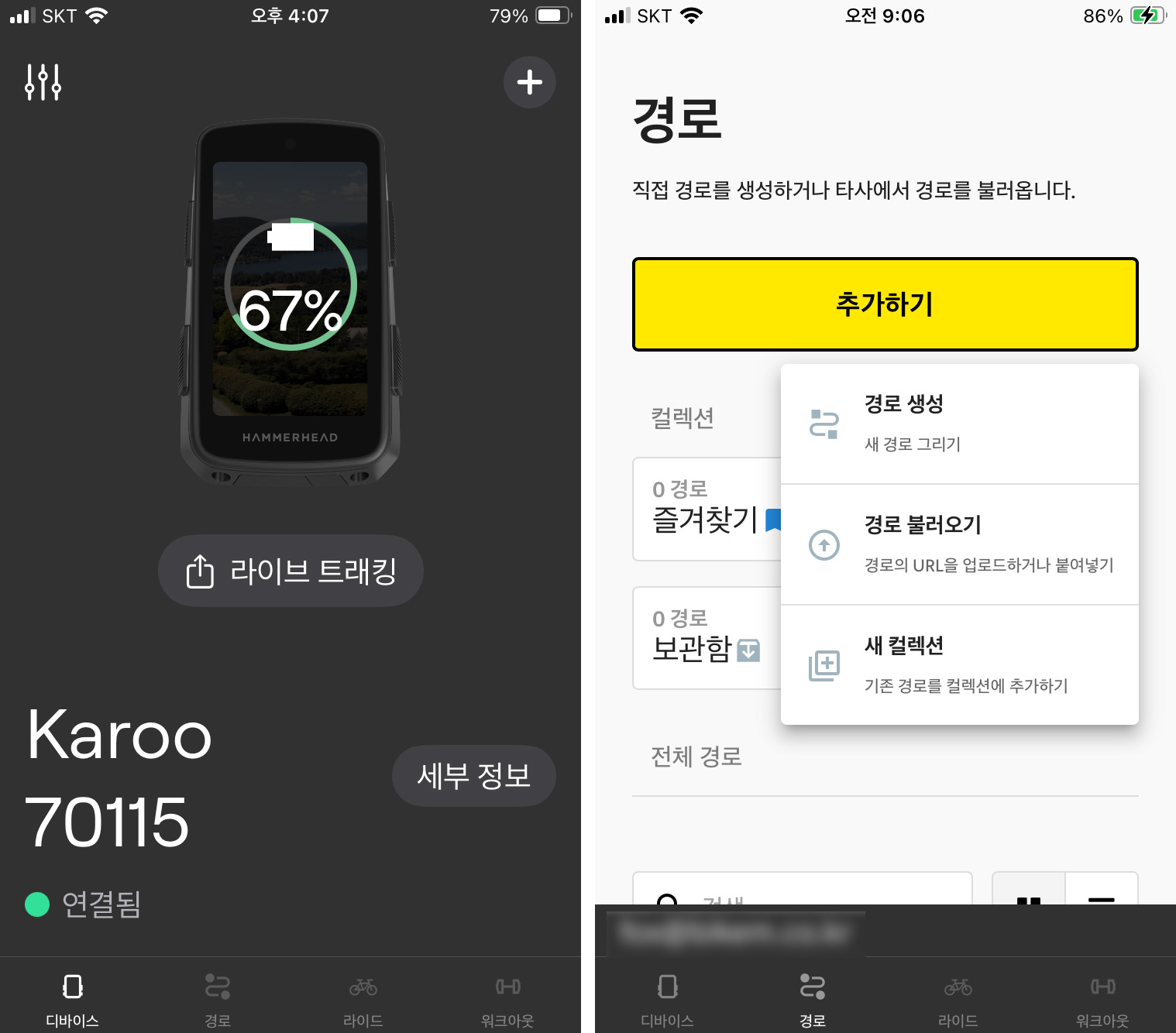 Hammerhead 앱을 이용할 때도 동일하게 경로 탭에서 추가하기로 코스 파일을 업로드 할 수 있다.