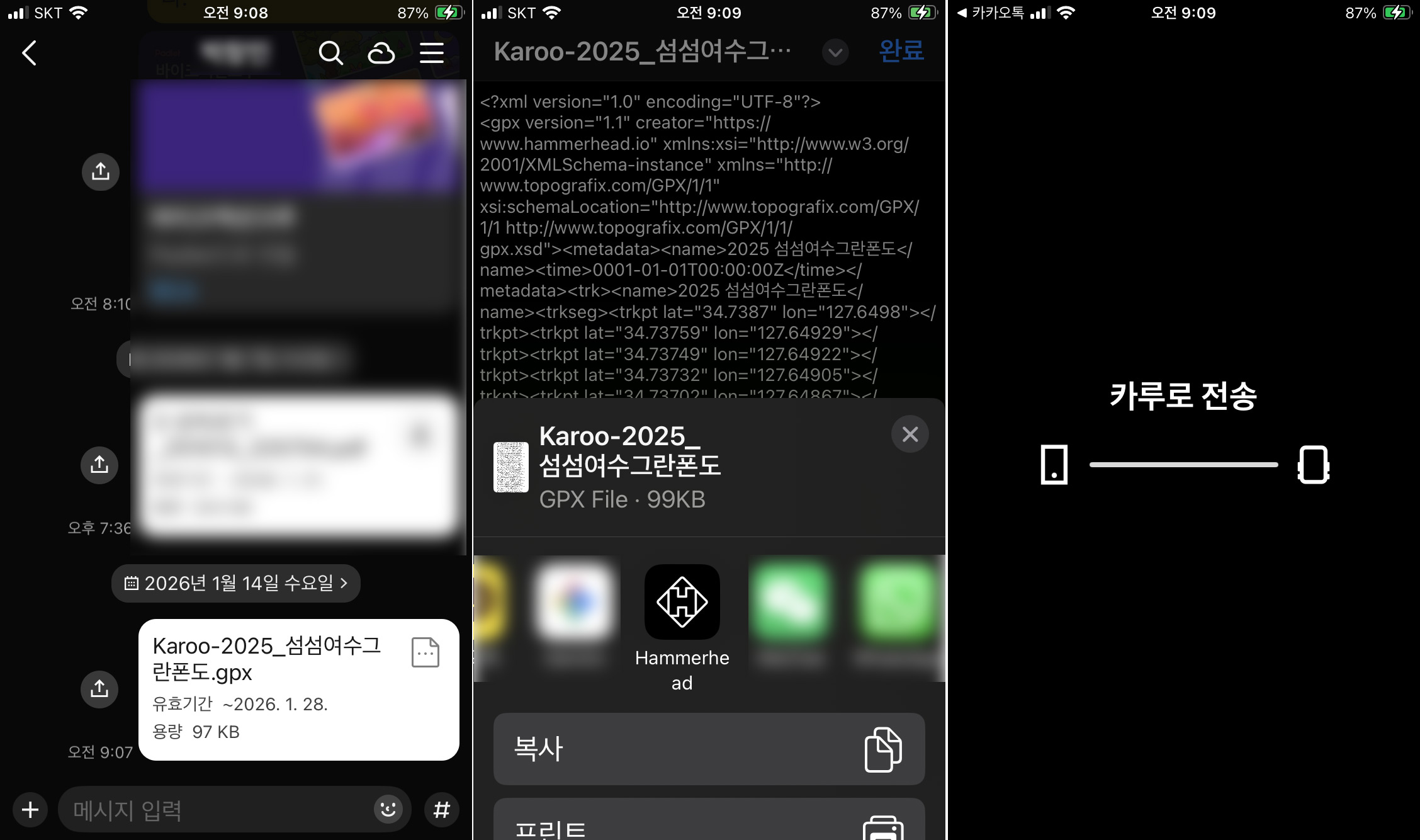 코스 파일을 카카오톡 첨부 파일로 받아서, 연결 앱을 Hammerhead로 선택하면, 위의 작업 없이 바로 코스로 등록된다.