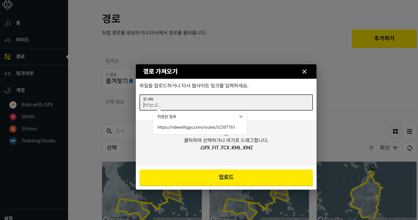해머헤드 카루의 강력한 코스 업로드 기능 중에 하나가 URL을 이용하는 방식이다. gpx, fit 등의 파일을 다운로드 받지 않고, RWGPS, 스트라바, Komoot 등의 코스 페이지 URL을 붙여 넣는 것 만으로 코스가 업로드 되는 기능이다.