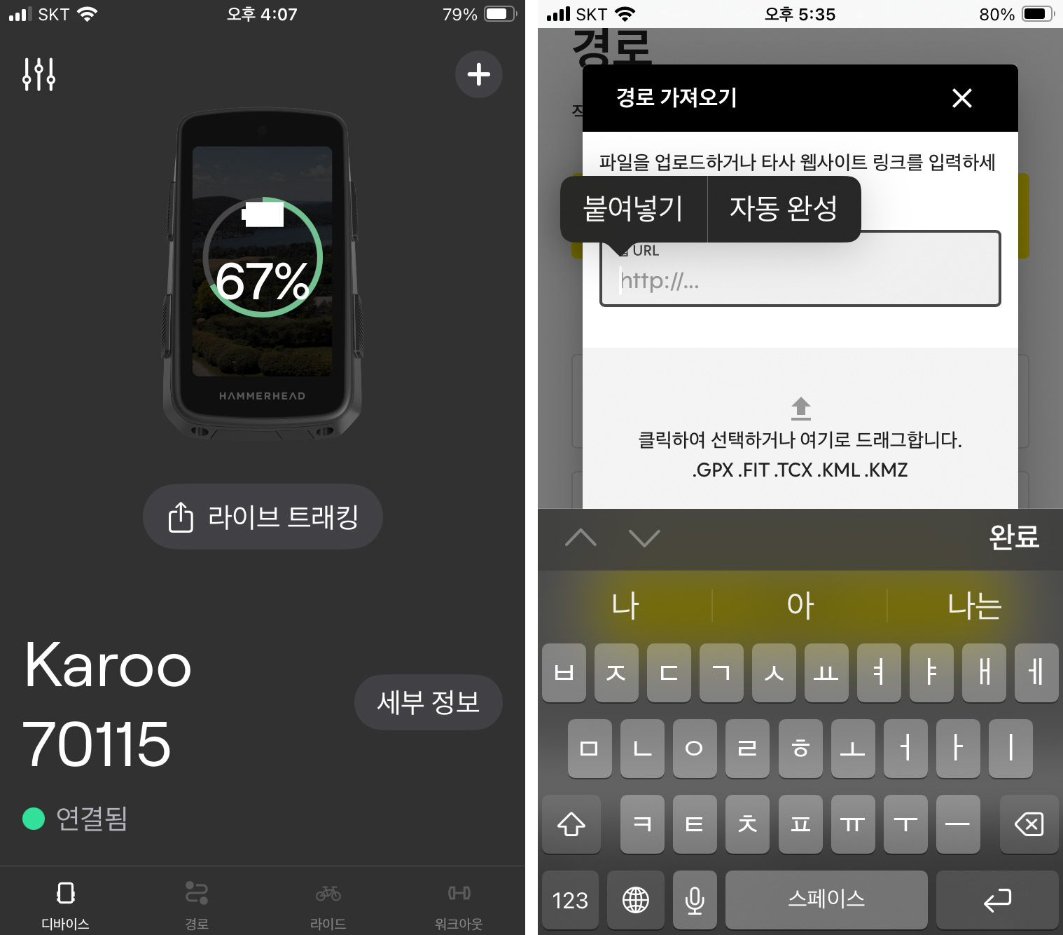 해머헤드 앱에서도 [경로] 탭에서 경로 가져오기 화면에 URL을 붙여넣기 하면 바로 저장된다.