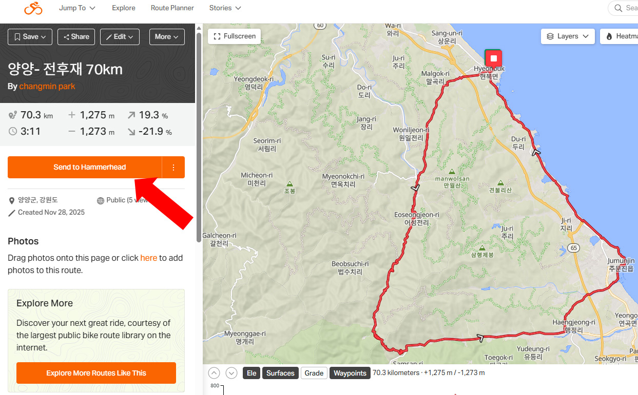 RWGPS 페이지에서 [Send to Device]를 해머헤드로 설정하면 클릭 한번으로 바로 전송 가능하다.