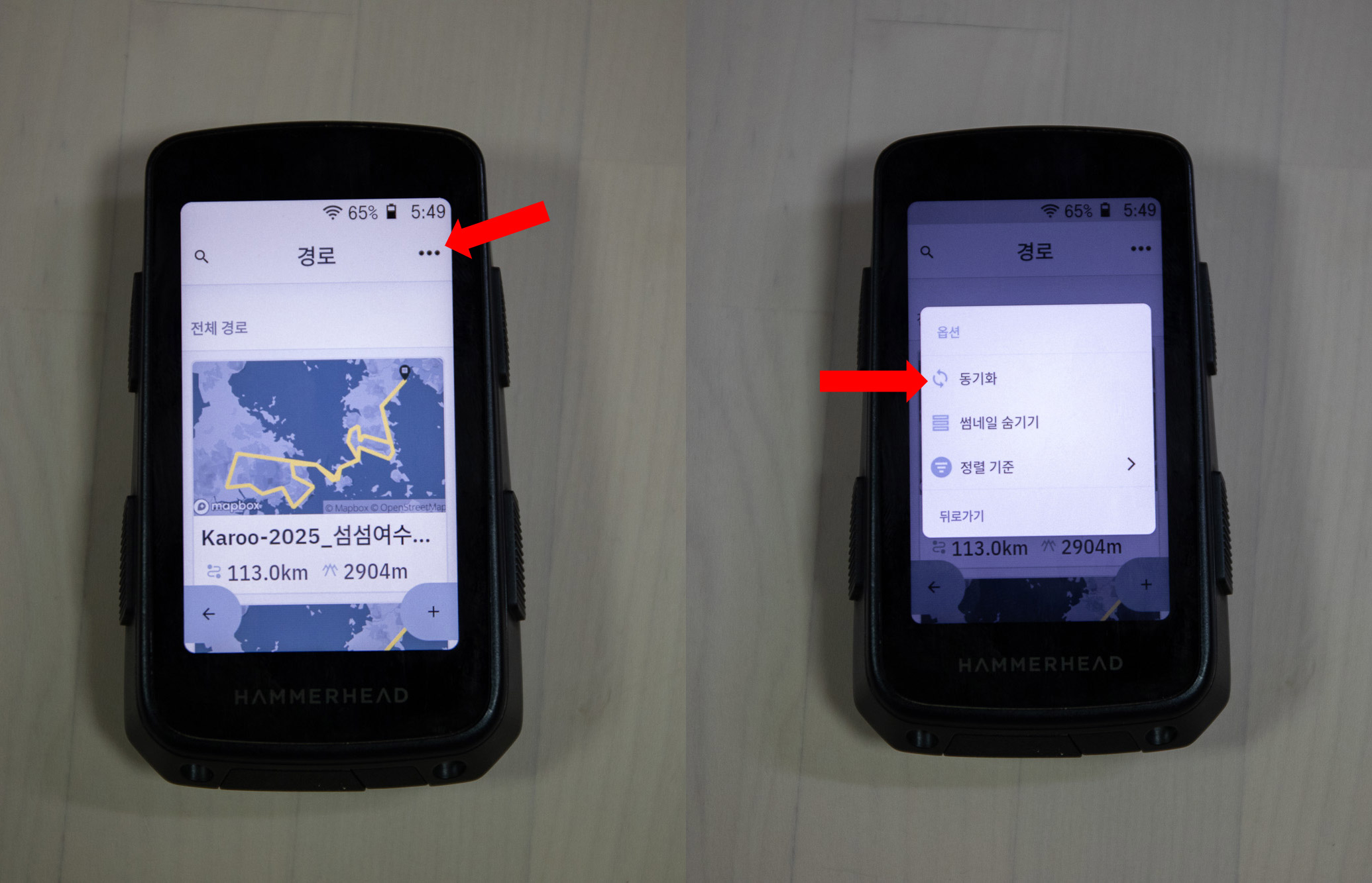 위와 같은 방법으로 대쉬보드 또는 해머헤드 앱에 코스가 등록된다 해도, 카루 헤드유닛을 온라인 상에서 싱크(sync)해야 코스를 카루 안에서 볼 수 있다.