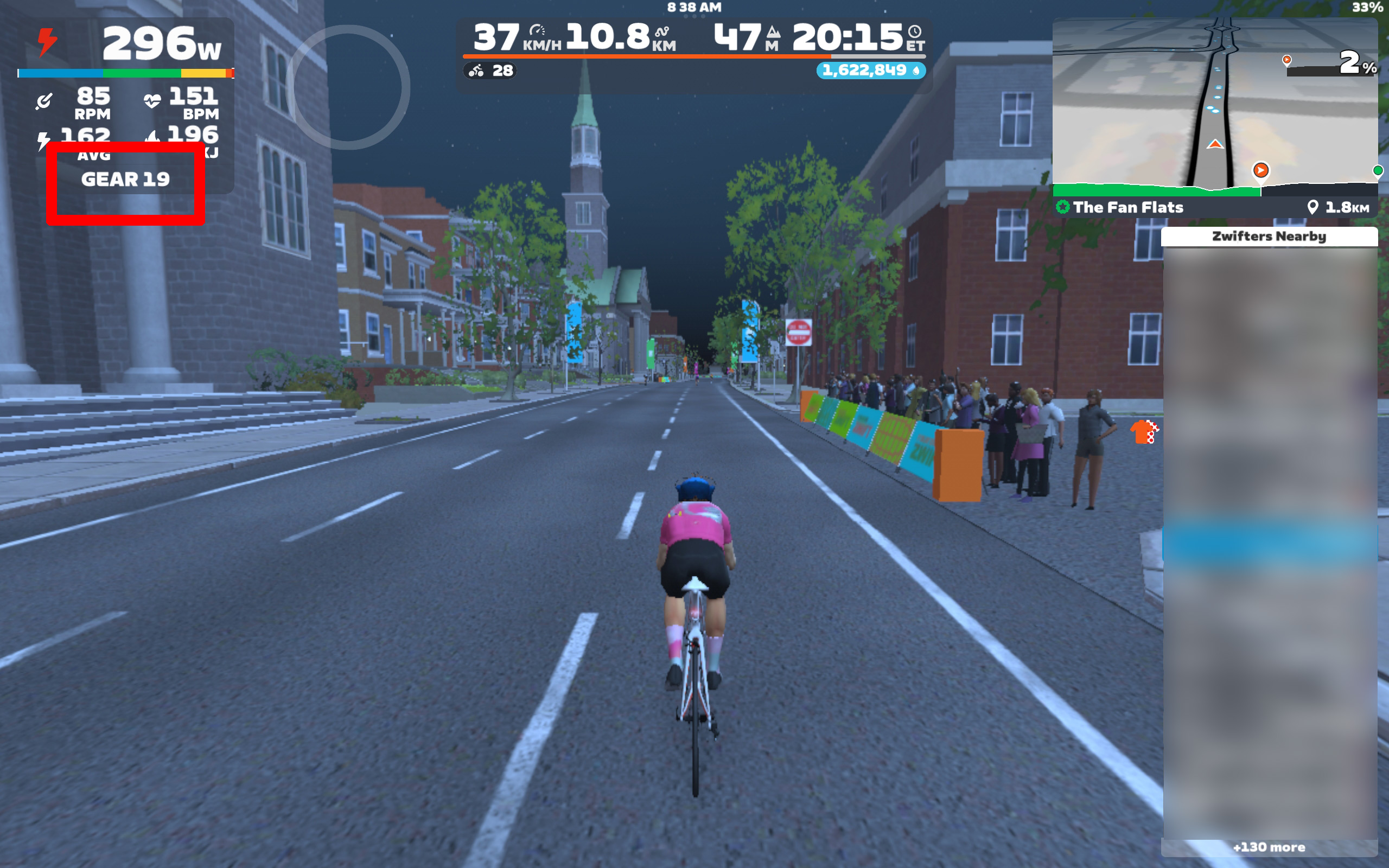 특히, 체인링을 작은 이너에 맞추고 주행할 경우, 플라이휠의 회전수가 낮기 때문에, 소음에 조금 더 유리할 수 있다. 즈위프트 클릭을 통한 가상 변속을 사용하기 때문에, 실제 자전거의 기어비가 그렇게 중요하지 않기 때문에 가능한 세팅이라고 볼 수 있다.