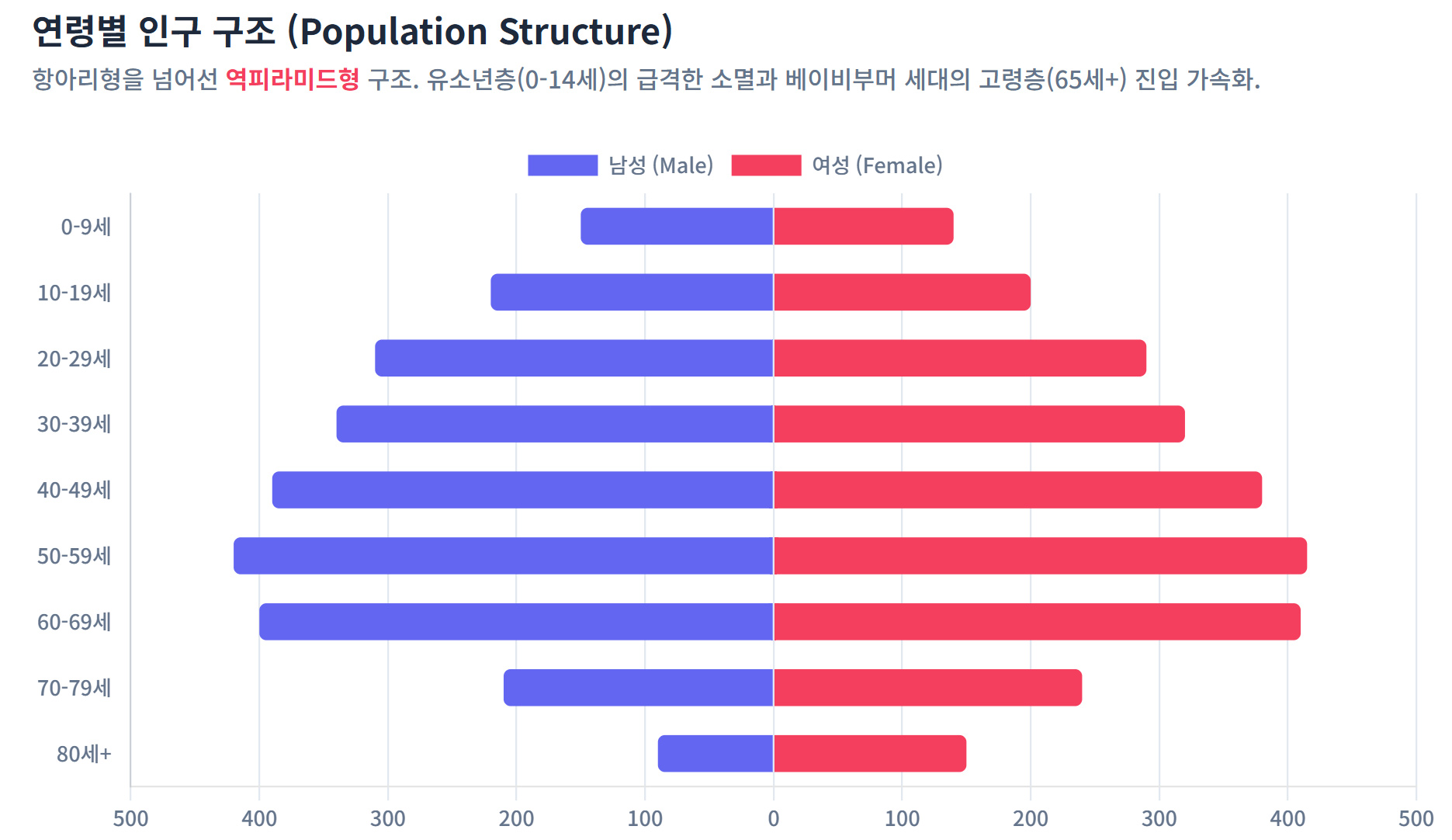우리나라의 인구 분포는 현재 50대가 가장 많은 비율을 차지하고, 나이대가 내려갈 수록 수가 적어지는 현상이 나타났다. 특히, 현재 10대의 인구는 50대 인구의 거의 절반 수준으로 적기 때문에, 앞으로 20대의 인구 감소가 가파르게 진행될 것으로 예상되는 시점이다.