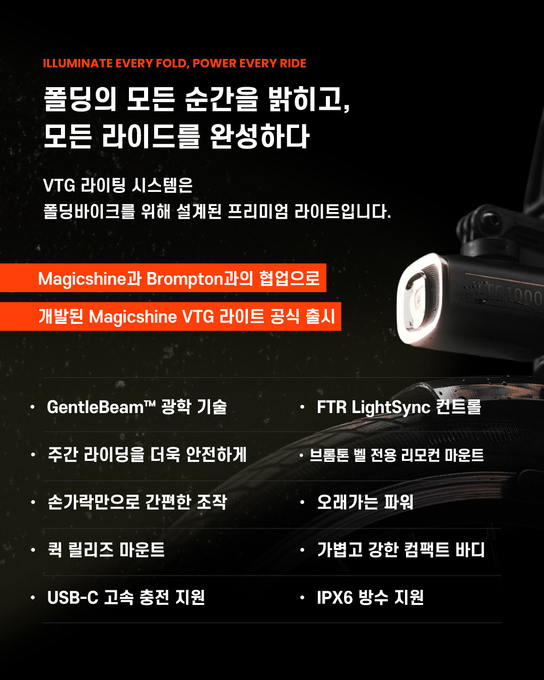 브롬톤(Brompton)과 협업으로 개발된 매직샤인(Magicshine) VTG 라이트가 우리나라에 공식 출시되었다. 전조등과 후미등 콤보로 설계된 이 제품은, 폴딩바이크(미니벨로)에 잘 어울리는 컴팩트한 사이즈와 성능을 가진 것이 특징이다.