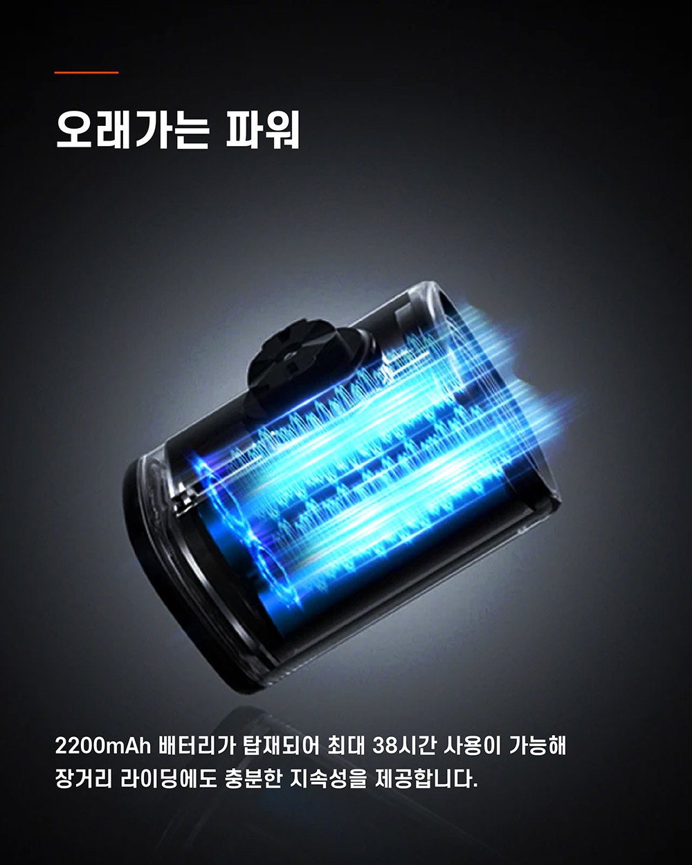 또, 2200mAh 배터리가 내장되어 최대 38시간 사용이 가능하다. 매일 출퇴근 하는 라이더라도 1주일 동안 충전없이 사용할 만큼 여유로운 용량이다.