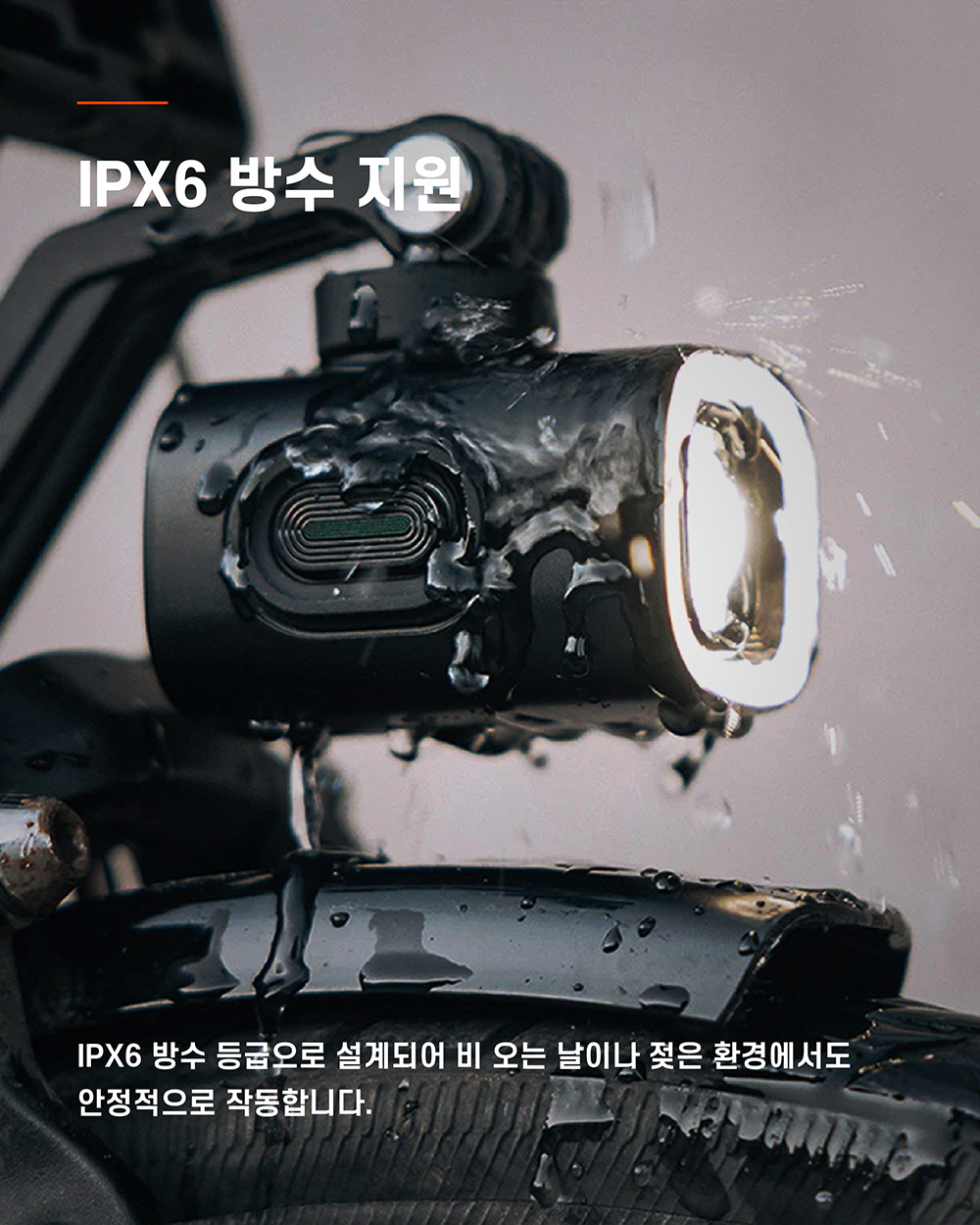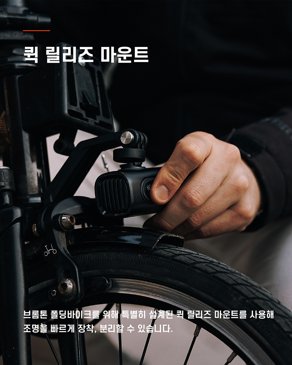 퀵릴리스 마운트가 적용되었기 때문에, 폴딩 시 간편하게 분리할 수 있도록 디자인한 것도 장점이다. 물론, IPX6 방수 기능과 알루미늄 하우징을 통한 내구성도 신뢰도를 높였고, USB-C 고속 충전으로 빠르게 라이딩을 준비할 수 있다.