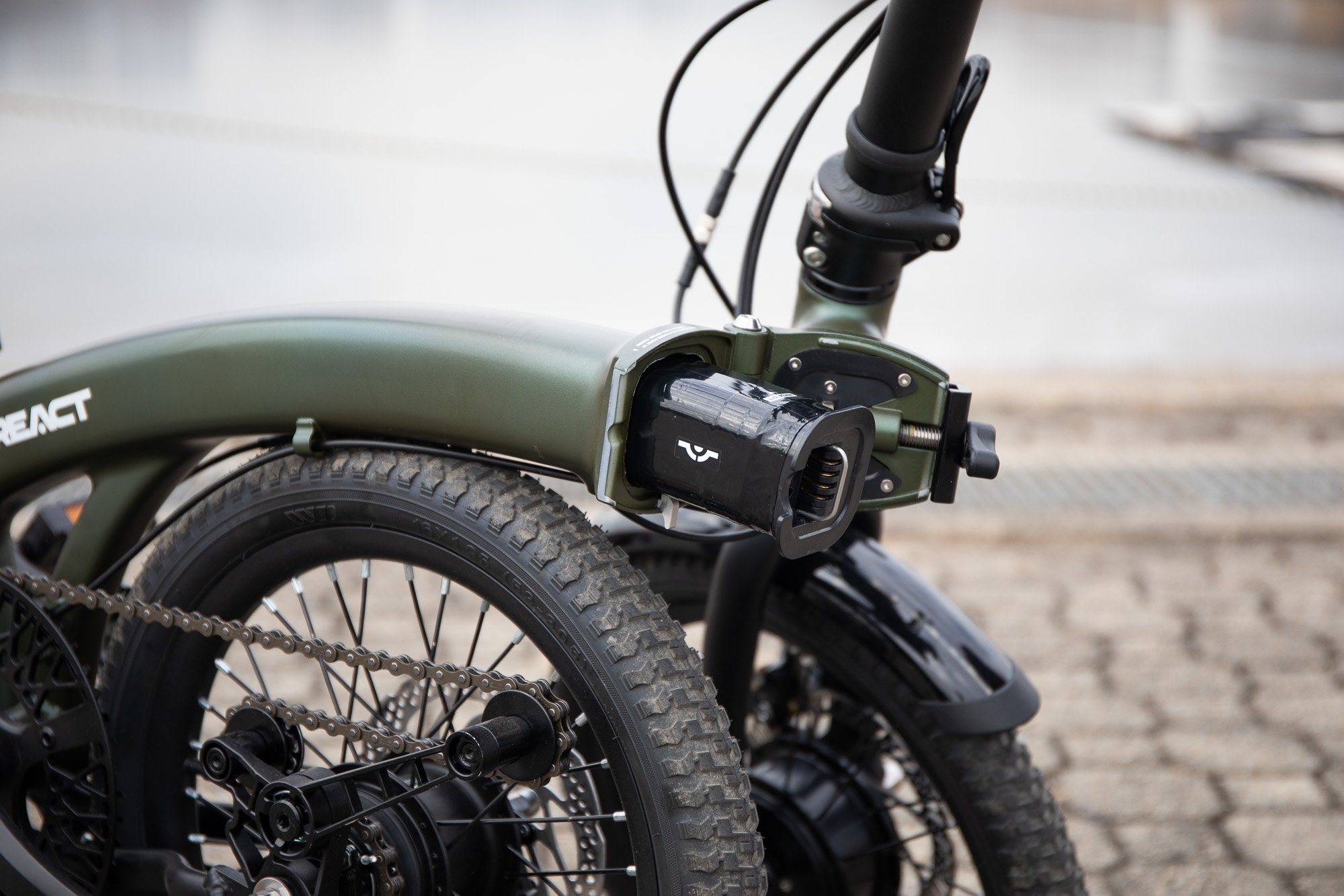 16인치 휠 사이즈와 폴딩 기능을 모두 만족하기 위해 림 브레이크를 채택하는 경우가 많지만, 리액트는 전기자전거의 무게와 속도를 감안해 디스크 브레이크로 제동력을 향상시켰다. 케이블 방식의 브레이크지만, 미니벨로의 특성 덕분에 제동 성능은 충분히 여유로웠다.