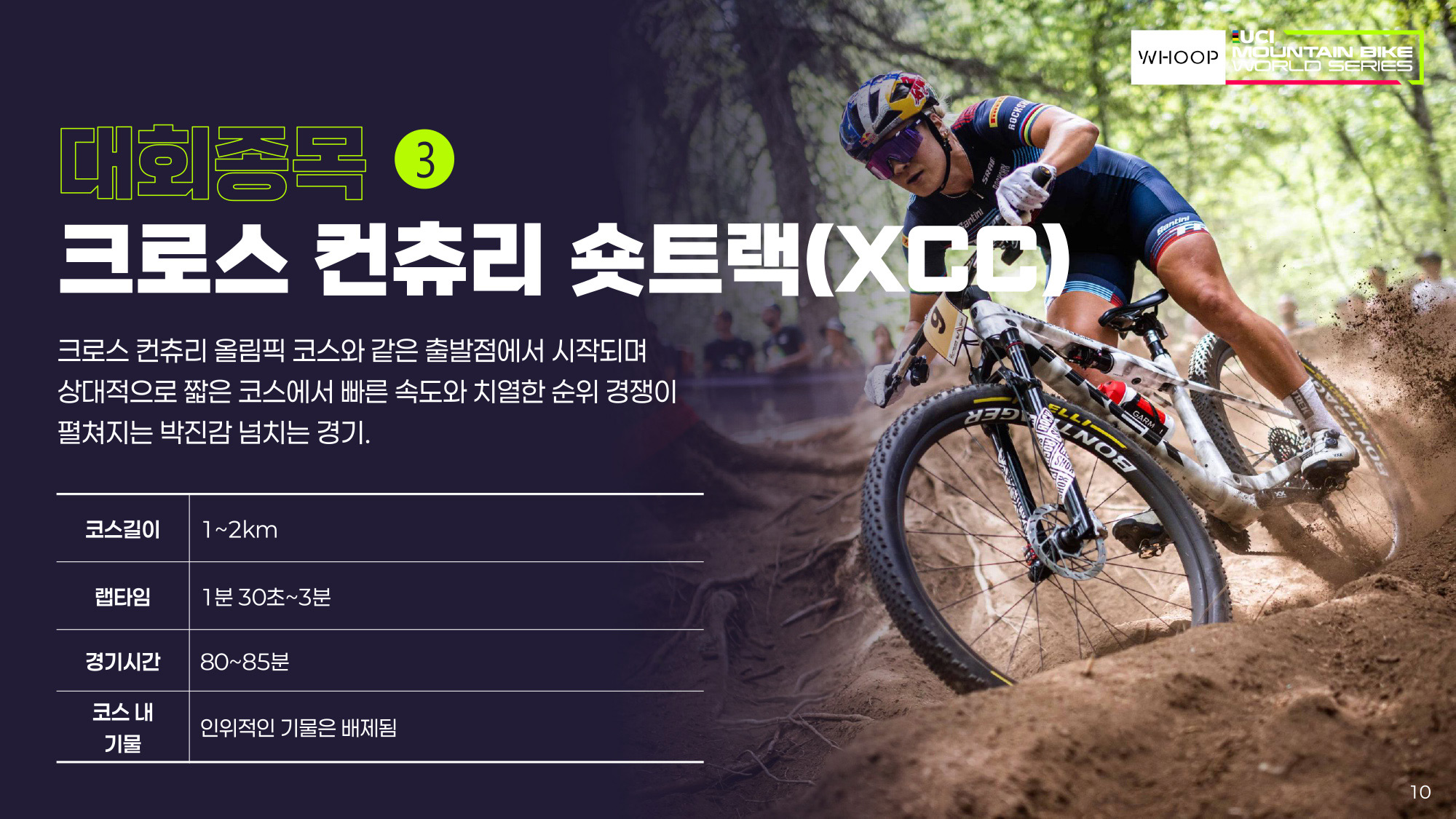 XCO와 동일한 출발점에서 시작하지만, 코스 길이를 1~2km로 단축하여 진행하는 경기다. 우리나라는 1.09km의 코스가 준비되었으며, 약 20분 내외의 짧은 경기 시간 동안 치열한 순위 경쟁과 빠른 속도감을 즐길 수 있는 것이 특징이다.