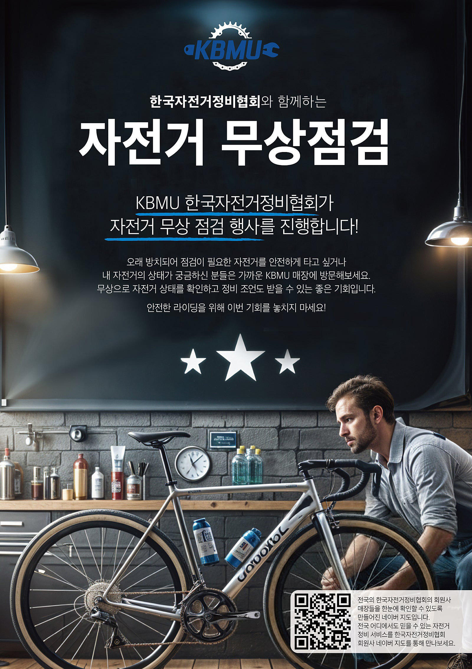 한국자전거정비협회에서 안전하고 건강한 자전거 생활문화 정착을 위해 전국 회원사와 함께 자전거 무상점검을 실시한다. 자전거를 타기 전, 작은 점검이 큰 사고를 예방할 수 있기 때문에, 이번 기회를 통해 자전거 상태를 전문가에게 점검 받을 기회가 될 것이다.