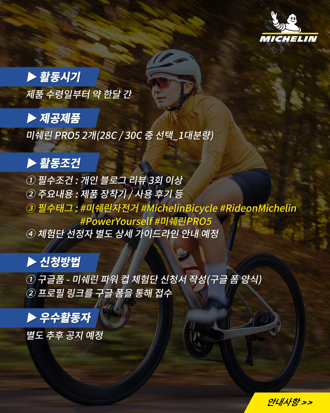 필수 해시태그: #미쉐린자전거 #MichelinBicycle #RideonMichelin #PowerYourself #미쉐린PRO5