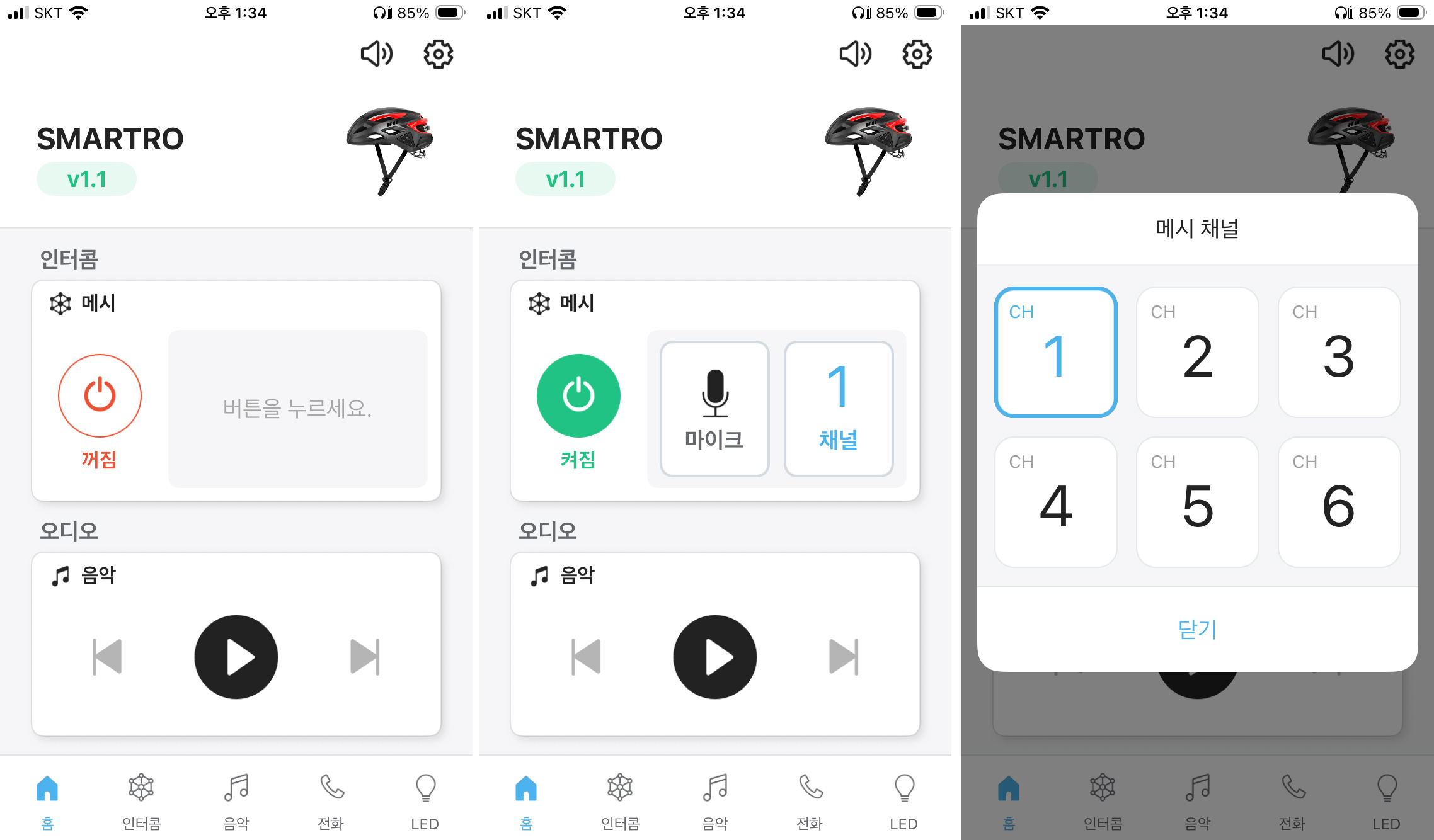 메시 인터콤은 가운데 버튼으로 ON/OFF 할 수 있고, 길게 눌러 마이크의 ON/OFF도 가능하다.