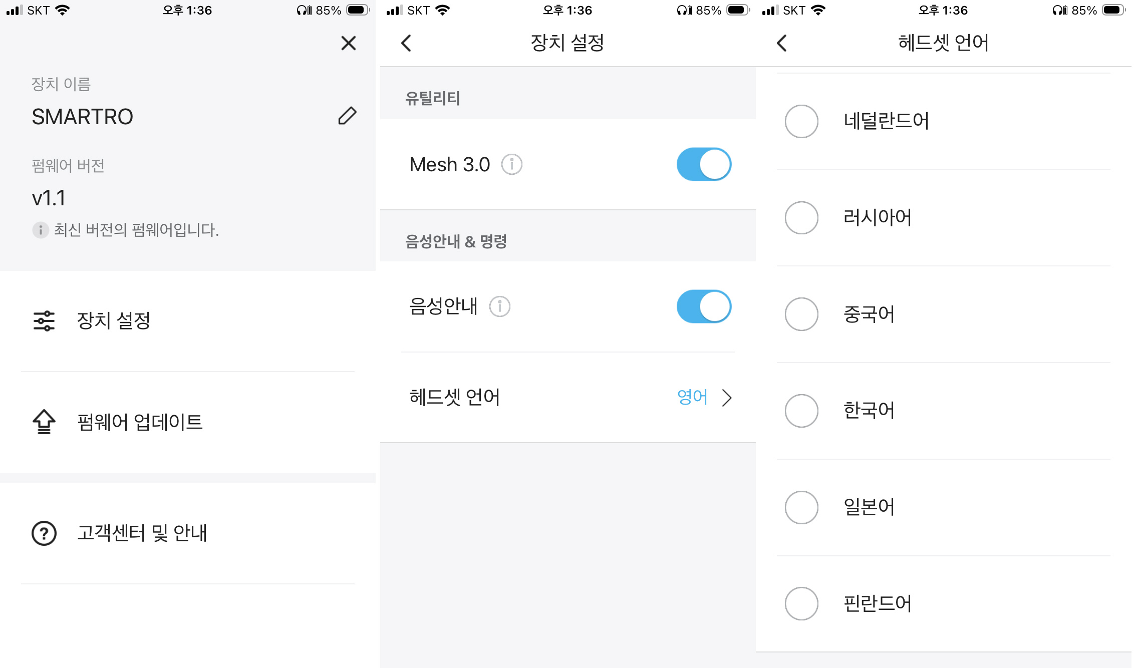 설정 화면에서 펌웨어 업데이트 및 언어 설정이 가능하다.