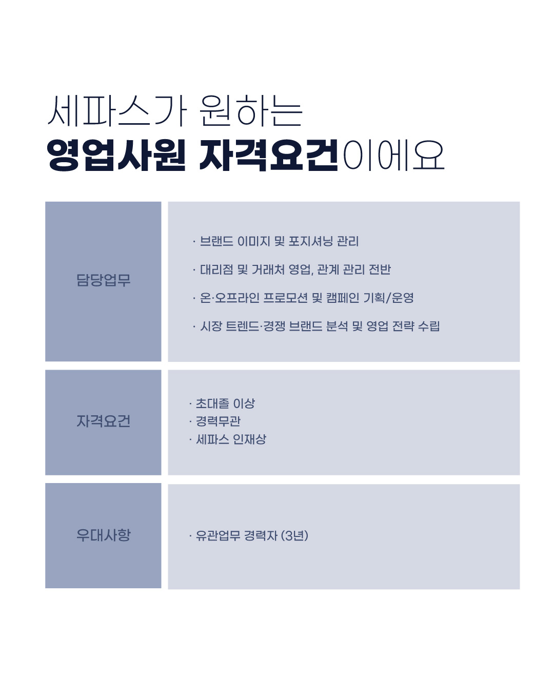 써벨로, 피직, 피렐리, 카스크 등 다양한 자전거 관련 제품을 유통하는 세파스는 아래와 같이 영업사원을 채용한다.
