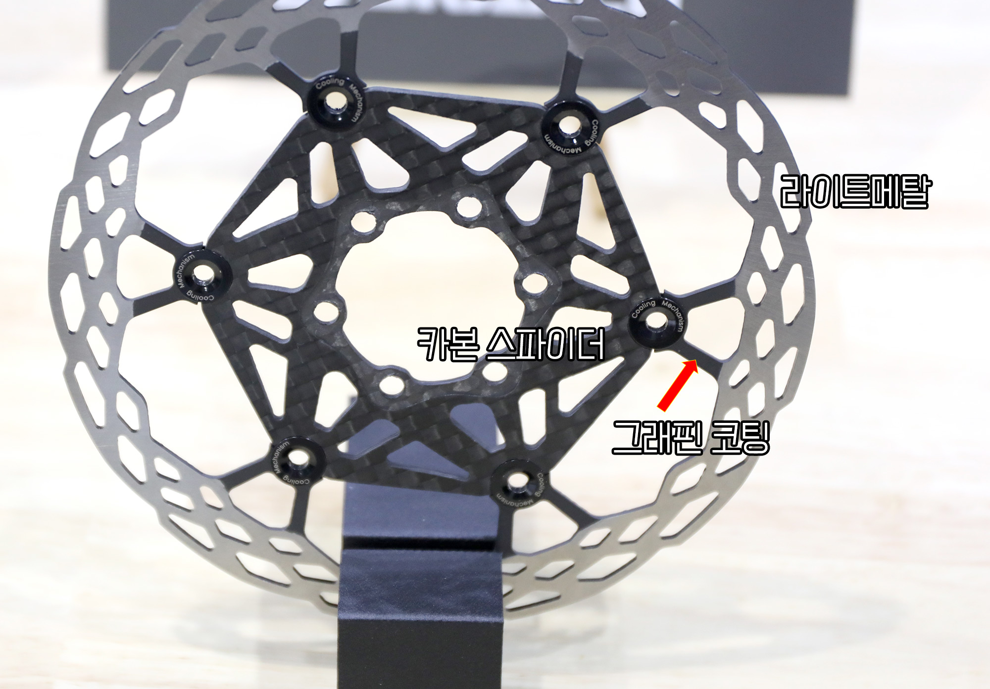 기본적인 로터의 구성은 마운트 부분의 카본이 7개의 레이업으로 완성되었고, 브레이크 밴드는 라이트메탈을 적용해 160mm 로터의 무게를 90g 대로 유지했다. 또, 브레이크 마찰열을 조금이라도 더 빠르게 냉각시키기 위해, 카본과의 접합부를 그래핀 소재로 코팅하고, 플로팅 리벳 구조로 완성했다.