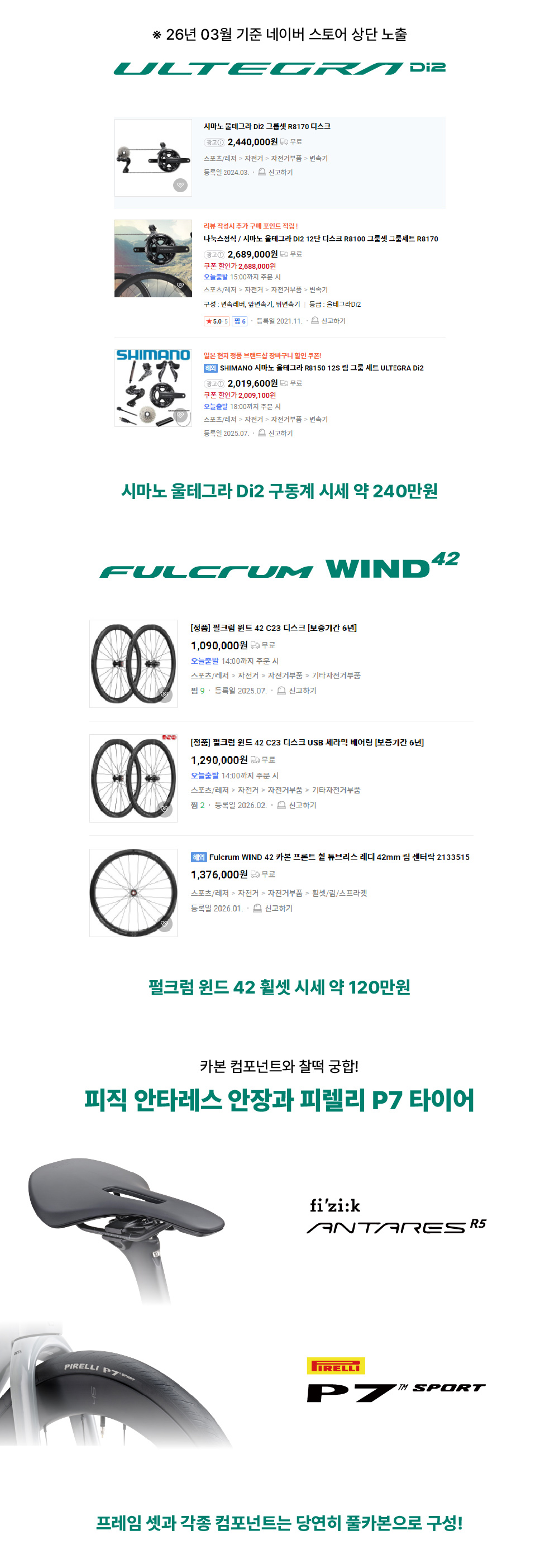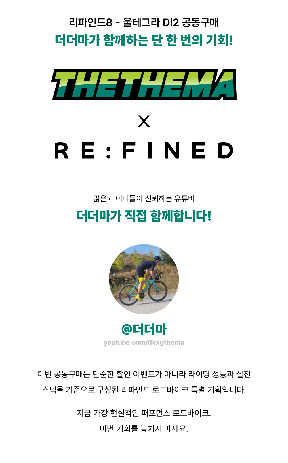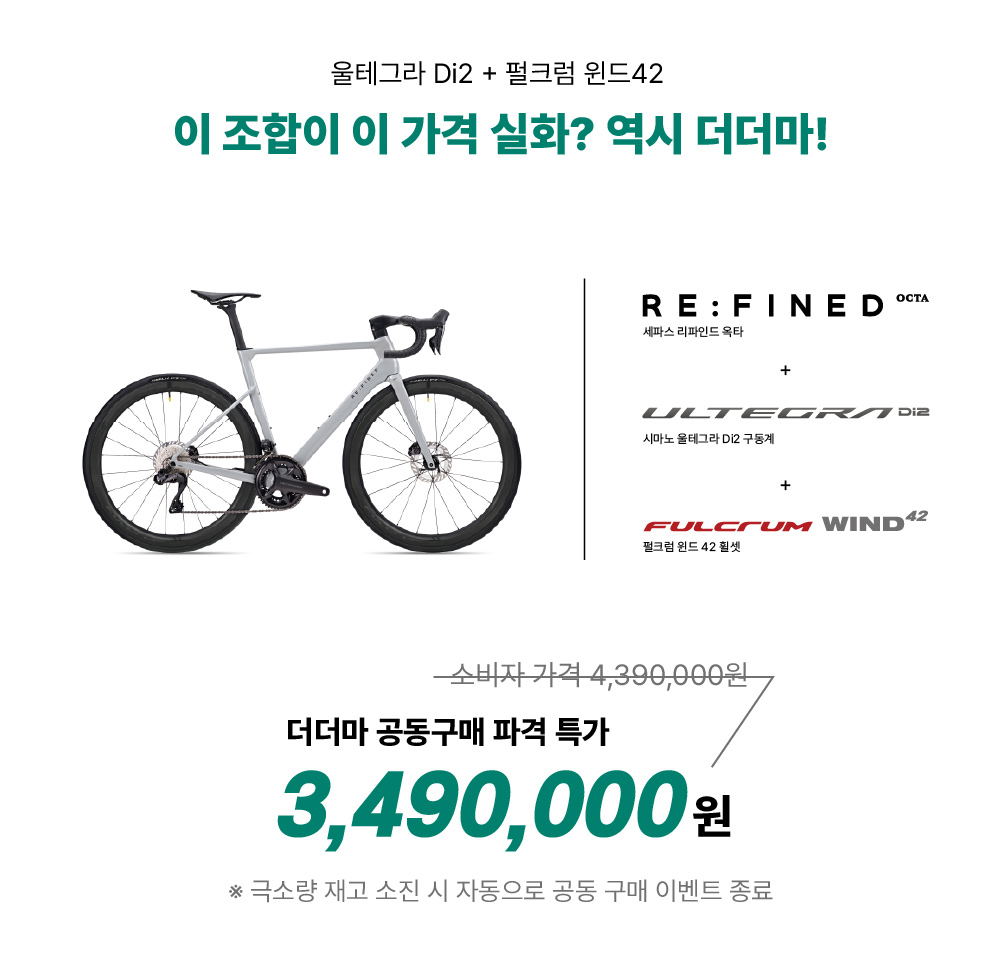 세파스 리파인드8 OCTA, 울테그라 Di2 349만원 프로모션 2026년 04월 02일 에디터 : 바이크매거진 세파스는 유튜버 더더마와 함께 리파인드 특가 판매를 진행한다고 밝혔다. 이번 이벤트는 리파인드8 + 시마노 울테그라 Di2 + 펄크럼 카본 휠셋 구성으로 349만원에 구매가 가능하다.관련 웹사이트세파스: https://brand.naver.com/cephas/category/e7a65b88973d4d50a3110c24786aa465?cp=1