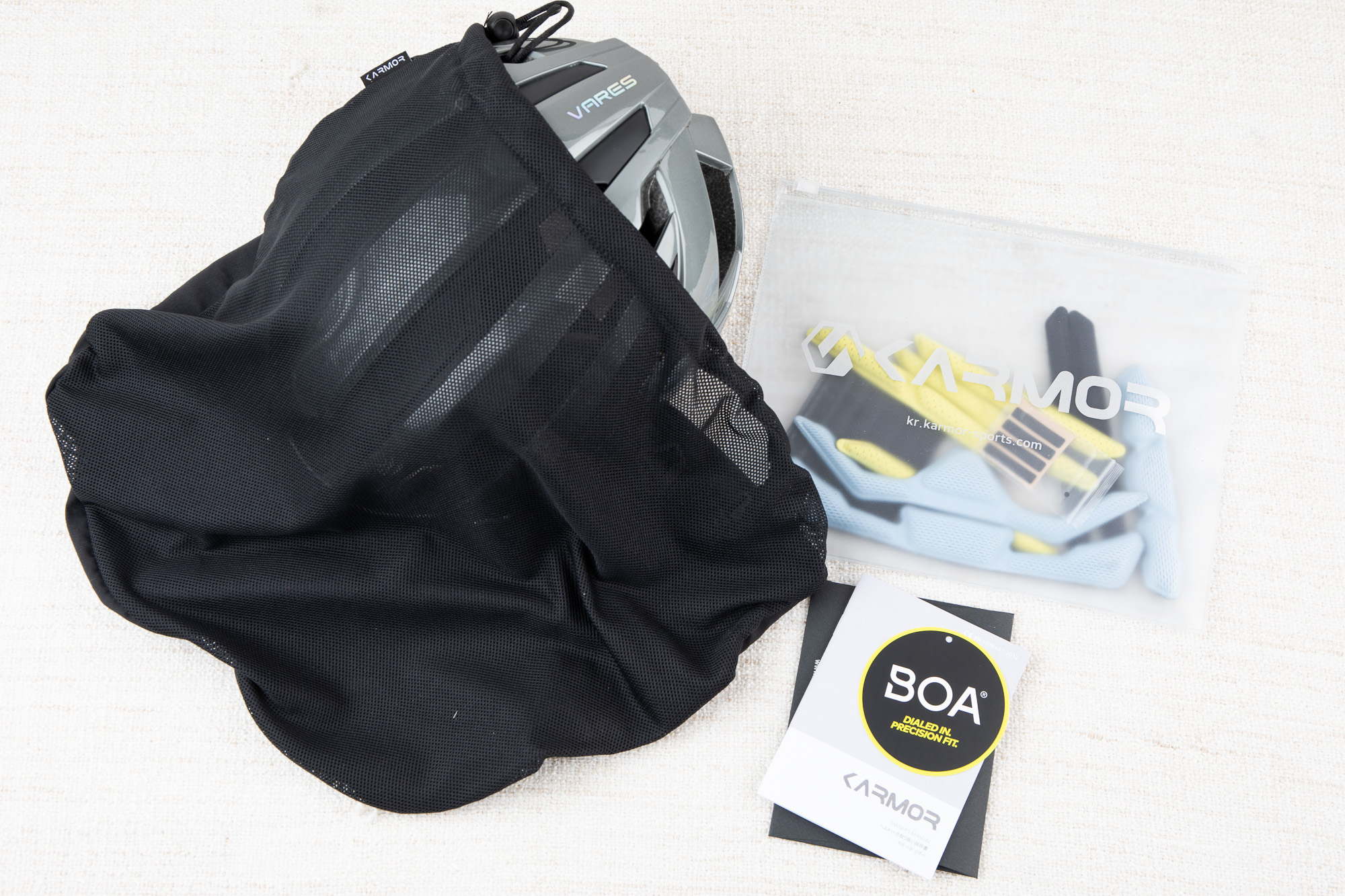 패키지에는 헬멧, 파우치, 추가 패드 등이 포함된다.
