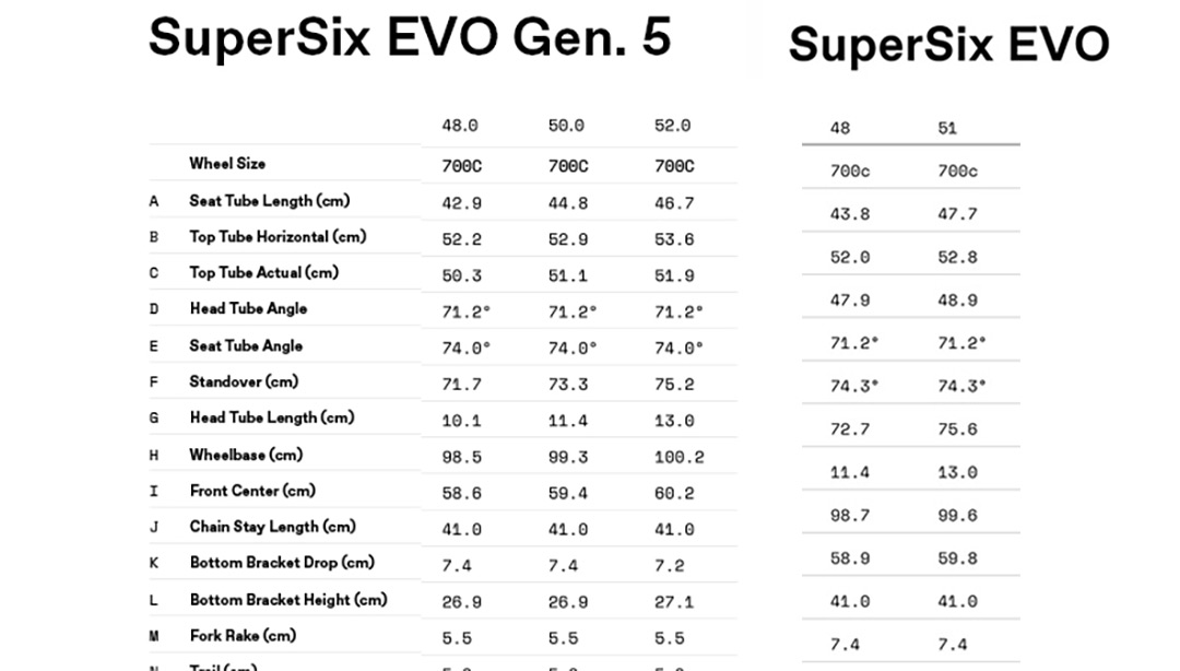 이에, 5세대 슈퍼식스 에보는 전 사이즈에 걸쳐 스택(Stack)을 일괄적으로 약 10mm 정도 낮추고, 유효 리치를 약 4mm 증가시키는 수정을 단행했다. 이는 더욱 공격적인 에어로 자세를 유지하도록 도와주어, 실제 스피드에 유의미한 영향을 준다.